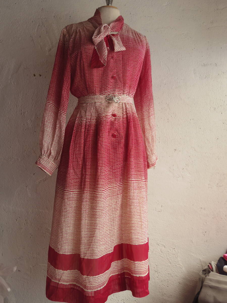 +--- 古着♪レトロVintage赤白柄クラシカルリボンタイモダン長袖ワンピ♪ ---+