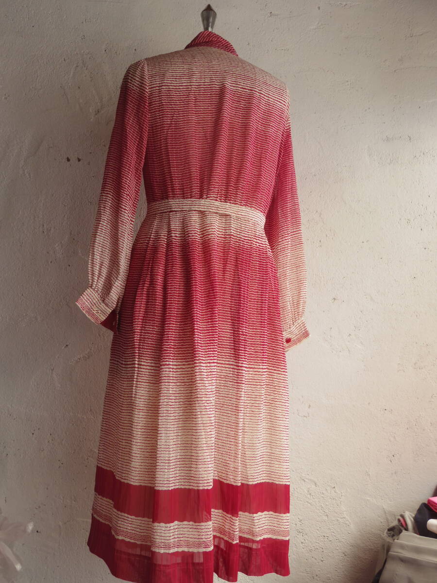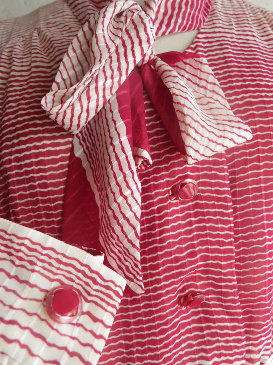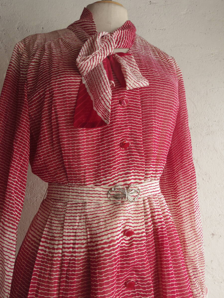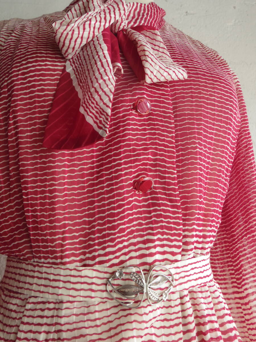 古着♪レトロVintage赤白柄リボンタイモダン長袖ワンピ♪昭和レトロワンピース70s60s70年代60年代昭和レトロビンテージクラシカルワンピ