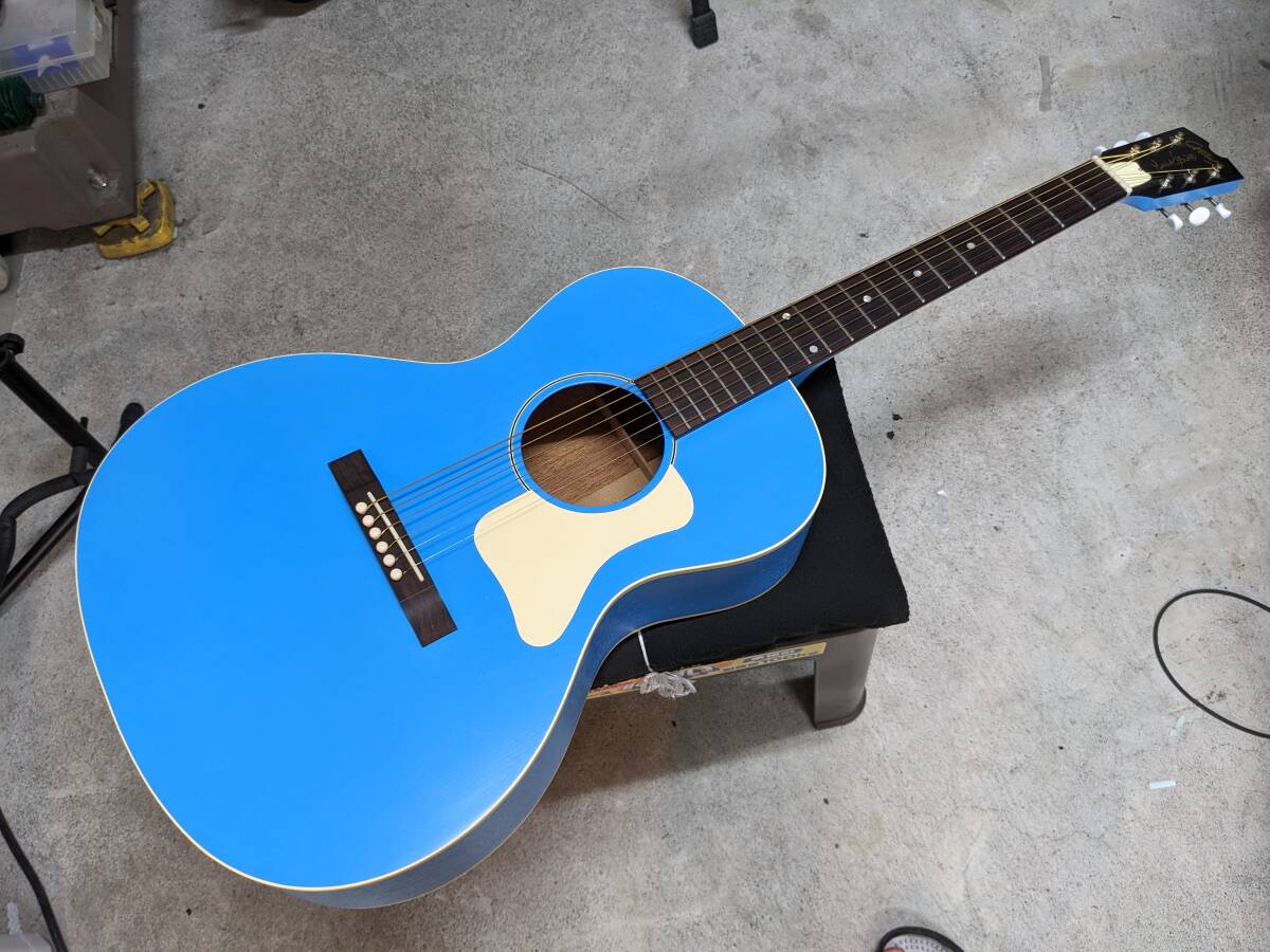 コンパクトなアコギ、トップはスプルース単板、側板はマホガニー合板、裏板はマホガニー単板、マホガニーネック、ローズ指板だったと思います。売ることは考えずガシガシ弾いておりましたので全体に小傷ありです。フレットも8~9割あると思います。カポは使わないのでカポ傷はないです。ネックもおおむねストレート。ブリッジ付近の異常なふくらみはありません。弦高は12フレット頭から1弦が2mm程度、6弦で2.5mm程度と標準的な状態です。トラスロッドはいじっていません。ヘッドにキズあり。