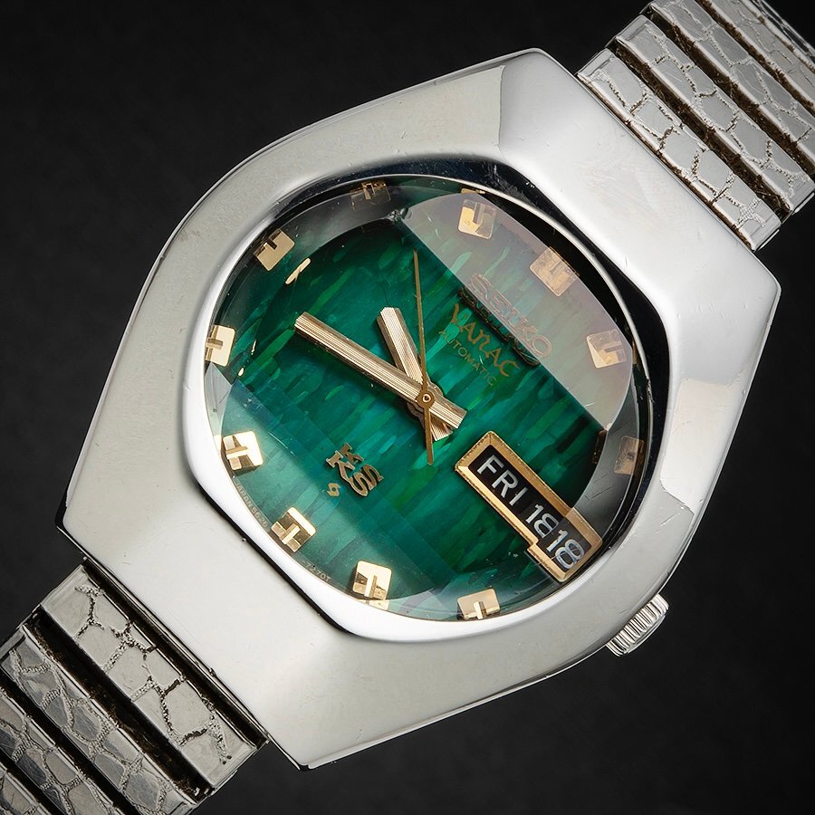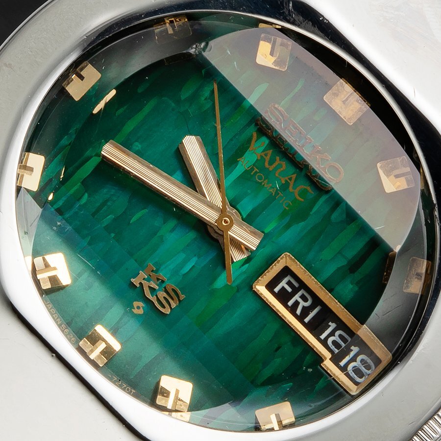 ステンレスの塊を抉りぬくようなその大胆なベゼルを無くした造形。 多面形のミネラルガラスを要し、そのガラスに映し出すグラデーションの色合いが レンズのようにVANACというその魂の響きをこのモデルの象徴として映し出している 太目の立体的アワーマーカーズ、それに伴うファットすぎる時分針が、セイコーの精度 に関する拘りたる高振動でありながら機械に負担をかける針の重さなど感じさせない セイコーの神髄までこのモデルから感じることが出来よう。 しかその大胆造形とは裏腹に、多面に削りだされたステンの鏡面とカラーグラデーション の輝きのフュージョンは、シンプルに美しいと直に表現してしまう。 今回ご紹介する5626-7240。7240らしい未来的造形が美しいたる造形は美として感じるほどの 存在感があり、グリーンのグラデーションカラーが、多面ガラスから見る角度により、明暗の色合い として、趣をその都度変えていくほどにその存在自体を変化させている。1972年にパナックは今回 ご紹介するグリーンにブルー、ブラウン、パープル、レッド、ホワイト、それぞれにダーク、ライト も存在するカラーリングで、キングセイコーのメインキャリとした5626を搭載することで、 キングセイコーファミリーとして誕生した。1973年には、セイコー初となる公式クロノメーターとした 5246キャリを搭載することで、キングセイコー上位機種となるスペシャルのクロノメーターモデルの 一員としてパナックスペシャルが誕生した。 今年2025年、”TOKYO HORIZON”としてこのキングセイコーパナックは生まれ変わった。 大谷翔平をセイコーのオフィシャルスポンサードとして迎え、まさにキングセイコーパナックの魅力 を高級感と品のある漂いがこのパナックの魅力となっていると語った