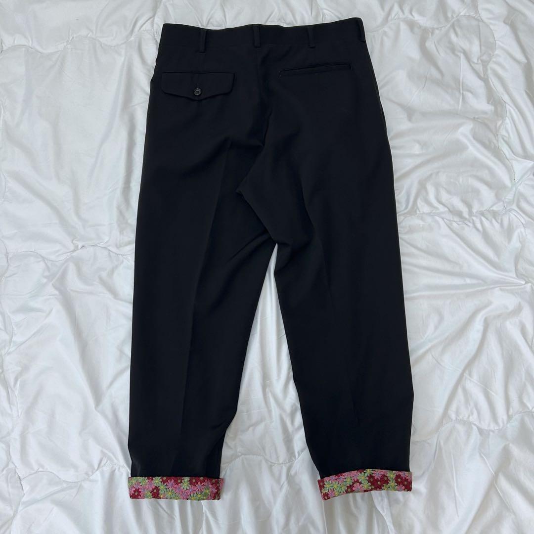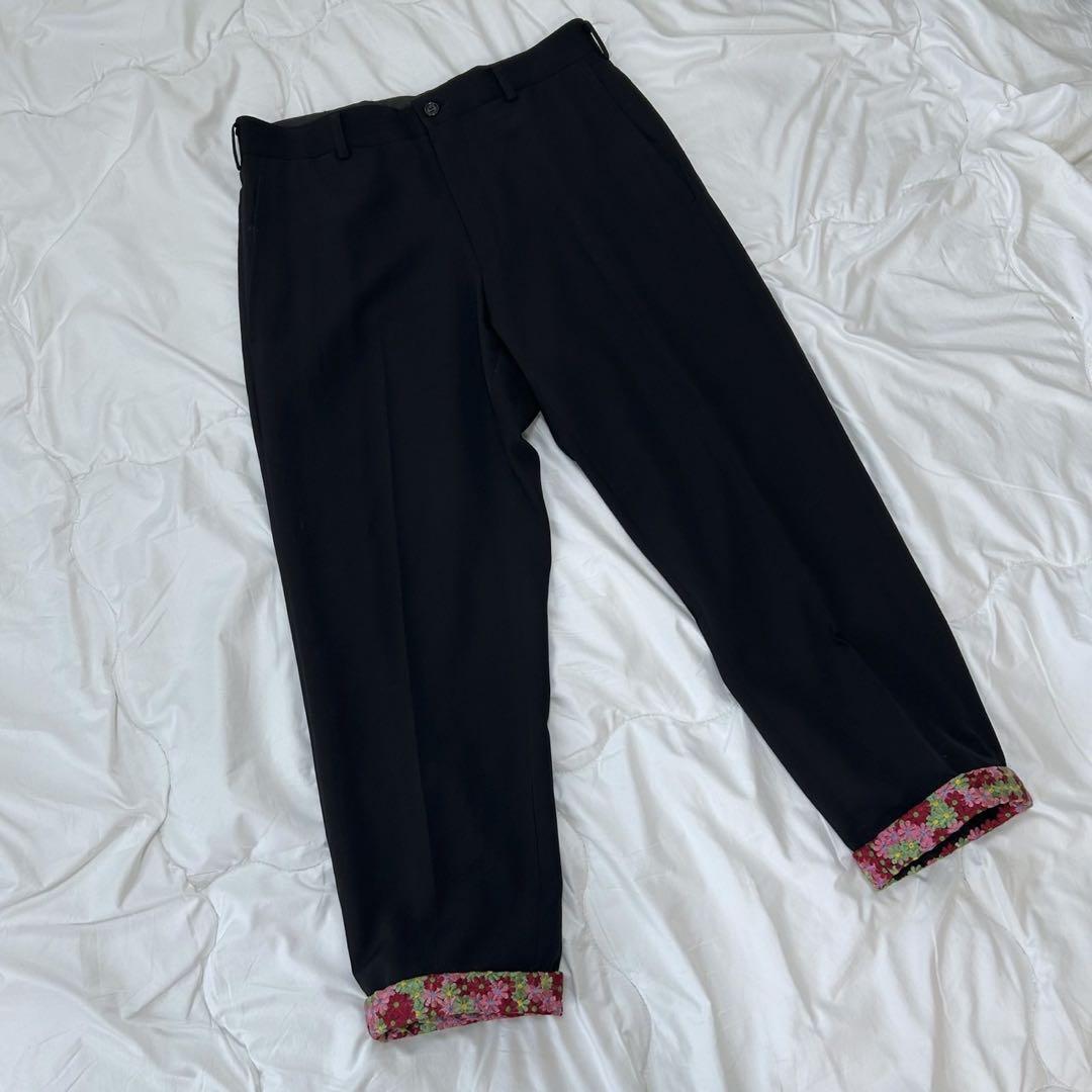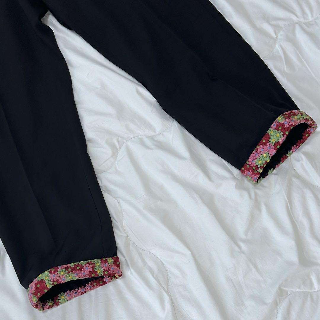 ベーシックなブラックのシルエットながら、裾には華やかな花の刺繍デザインが遊び心の効いた一本です。
