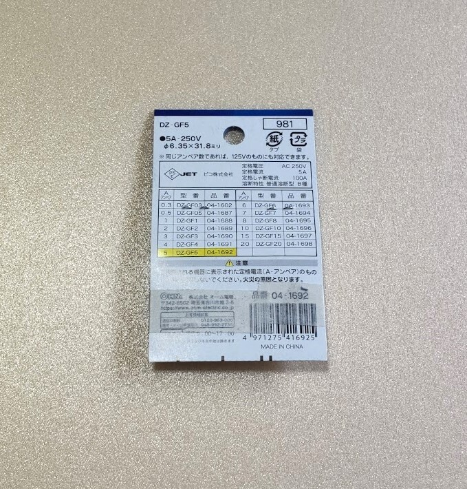 オーム電機 OHM ガラス管ヒューズ 5A-250V DZ-GF5 3本