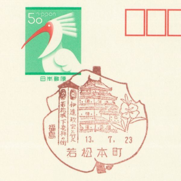 風景印☆初日☆福島・若松本町・H13.7.23・タチアオイの花の枠
