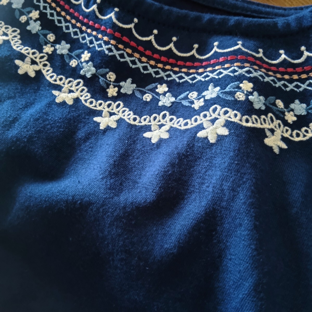 首もとの花柄レース刺繍がとても可愛いプルオーバーです。刺繍部分は裏地がついてるので肌に当たらずかなり気遣いのあるお作りです。