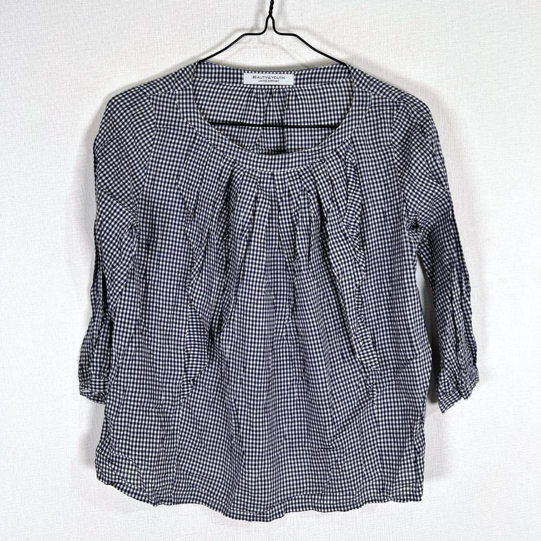 女性用のネイビー×ホワイト系の七分袖チェックチュニック トップスです。中古品ですが目立つ傷や汚れもなく、まだまだ使えます。古着 ビューティーアンドユース ユナイテッドアローズ 株式会社 ユナイテッドアローズ BEAUTY & YOUTH UNITED ARROWS