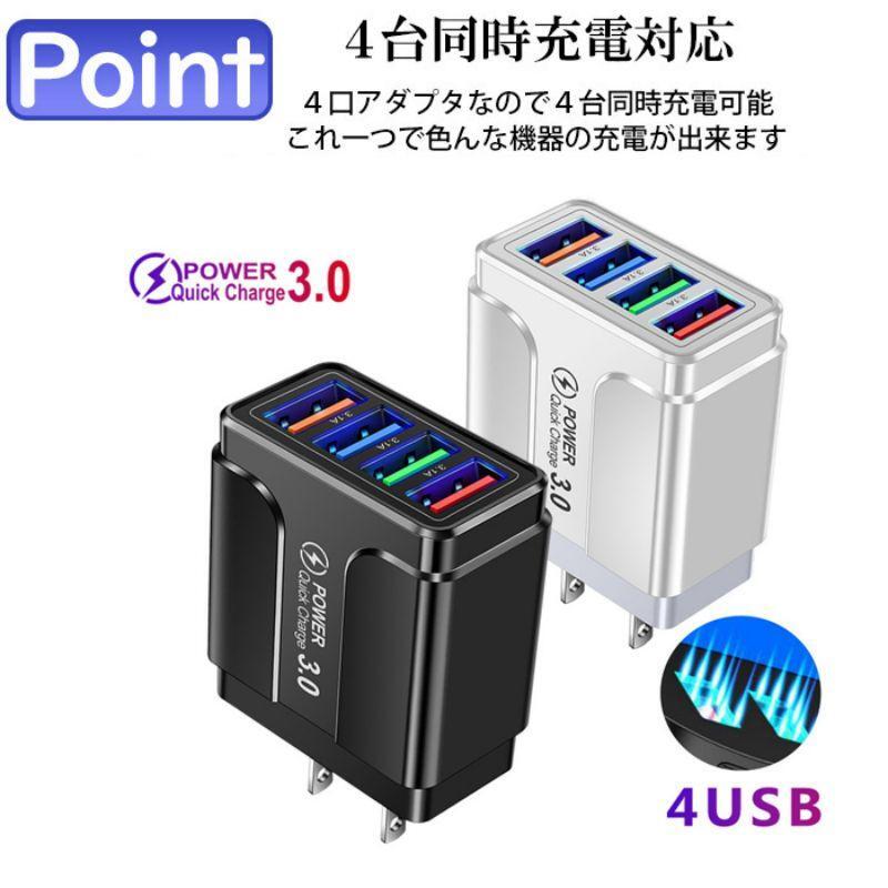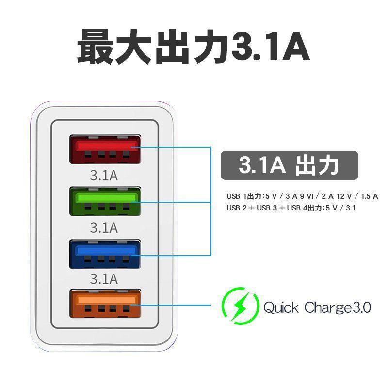 ※3ポート3.1A、1ポート3.0A。 全ポート全てが急速充電対応 ※QC3.0対応 USBポート×1搭載 従来の充電の約4倍もの速さでスマートフォンのフル充電ができるといわれているQuick Charge3.0対応のUSBポートを搭載。 ※ 充電する機器がQuick Charge対応の場合はQuick Chargeモードでの充電となります。 ※ Quick Charge非対応の機種の場合は通常の充電となります。 ※スマートIC搭載で賢く安全に急速充電 接続するだけで自動的にデバイスに最適な電流を検知します。 【ご注意】 ※機器によっては4台同時充電できない場合があります。 ※本製品に充電用USBケーブルは付属していません。 ※イヤホンやカメラ、モバイルバッテリーの充電などに、卓上扇風機や加湿器などのUSB機器の給電にも適用します。 ※AC100〜240V対応 海外でも使用可能 ※4台同時に充電している際など、機器の組み合わせにより高出力充電ができない場合があります。 ※ご使用のスマートフォンとUSB充電ケーブルの両方が高出力充電に対応している場合に、充電時間に短縮ができます。
