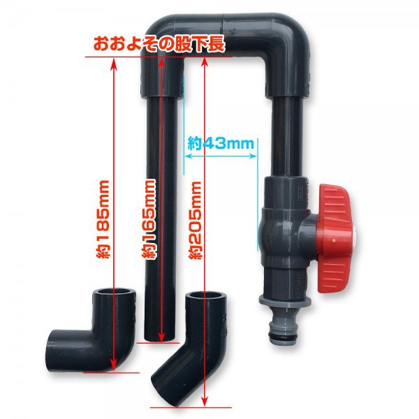 おおまかには、股下長さ、引っ掛け幅、ホース接続部がストレートかL型の組み合わせになります。