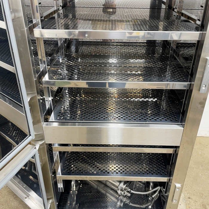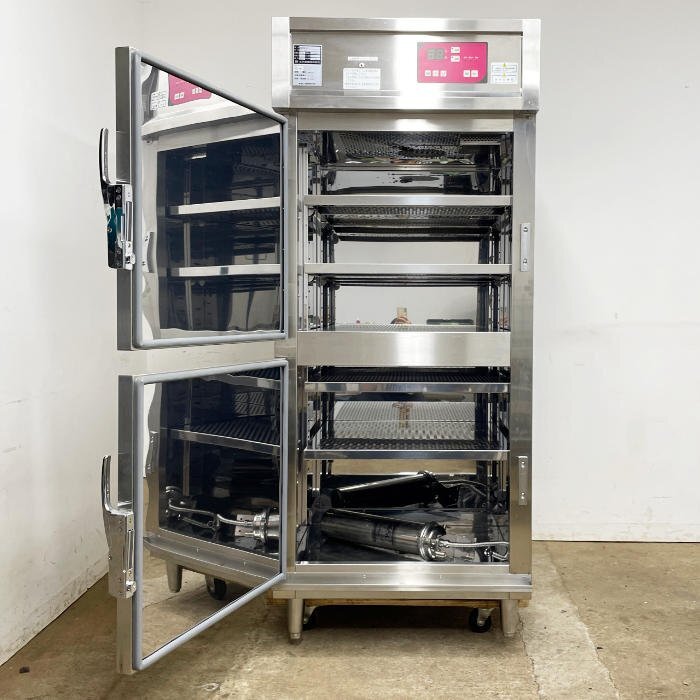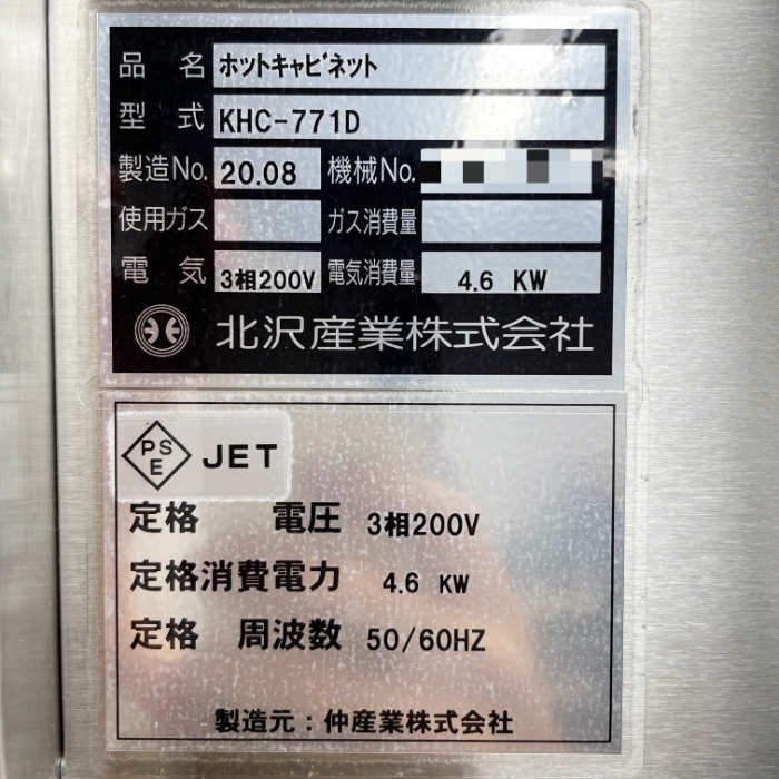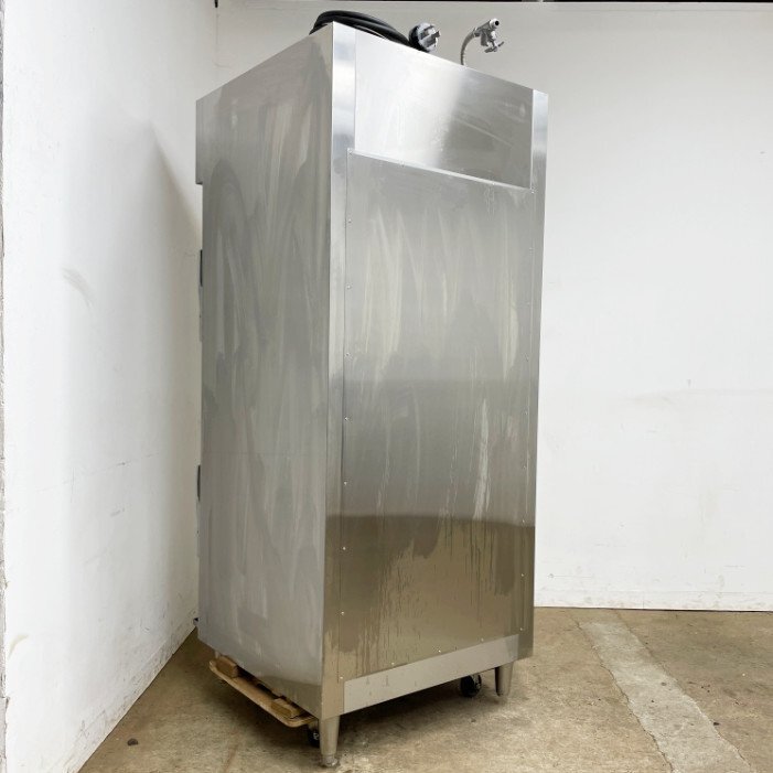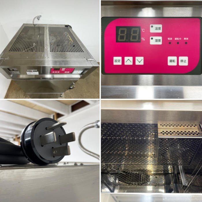 <仕様> 商 品 名 :ホットキャビネット メーカー:北沢産業 型 番:KHC-771D 年 式:2020年 寸 法:約 幅 750mm × 奥行 780mm × 高さ 1780mm 重 量:約 115kg 電 源:三相200V 50/60Hz 付 属 品 :軟水器×1 ※写真に掲載されているものが全てとなります。 <動作確認> ・温度80℃設定で81℃まで上がることを確認しました。 ・湿度99%設定で99%まで上がることを確認しました。 ・ファンの回転を確認しました。 ※実際の食材を使用しての動作確認を行っておりません。 <状態> ・キズ、汚れ等があります。 |