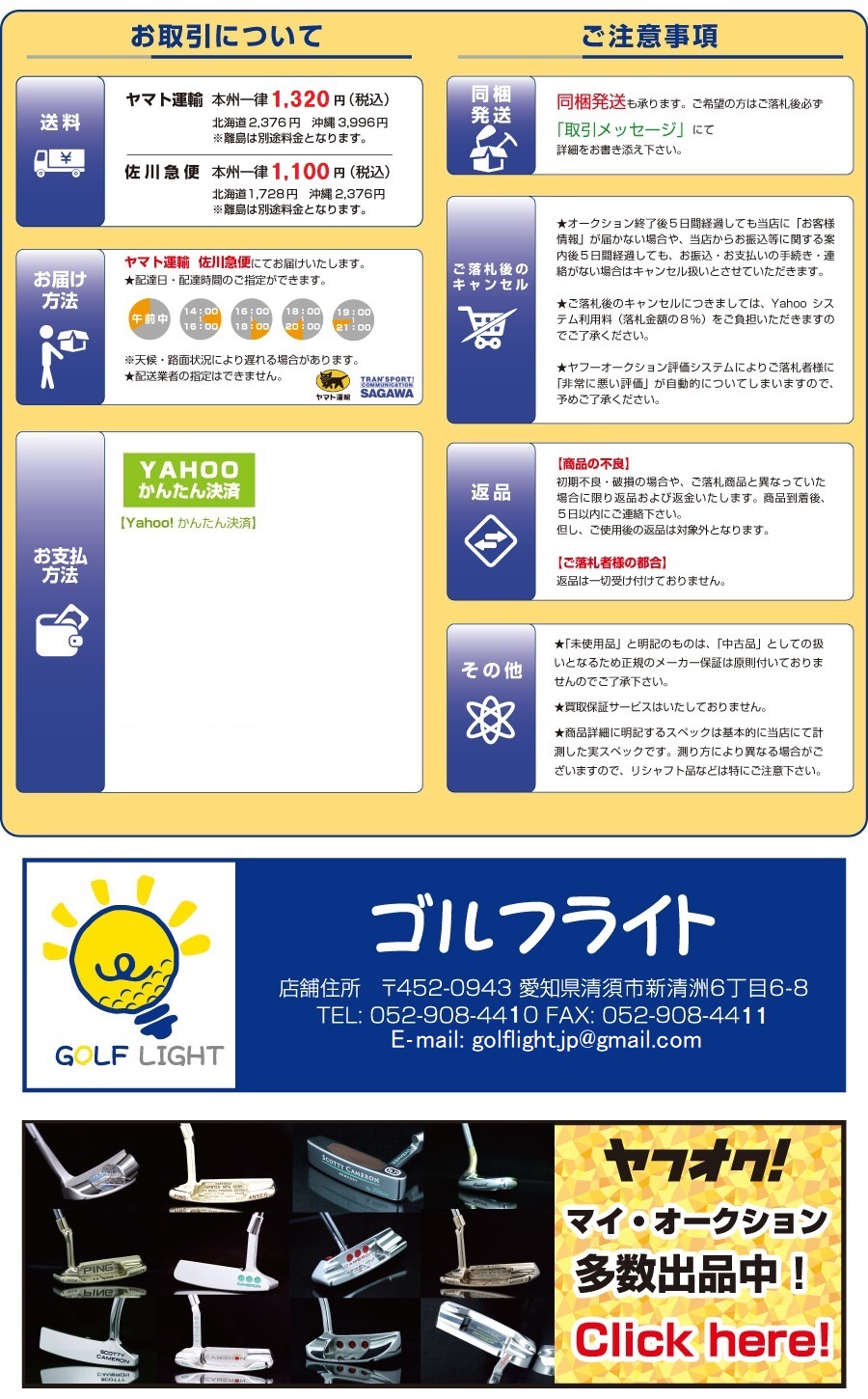ボティ:ミラーブラックに加工してます。加工後は未使用品です。 グリップ(ツアベル)、シャフト(DG/S200)は新品を装着です。 店頭に並べてありますので、ご来店頂けましたら現物確認できます。 あくまで中古品とご理解の下、お願い致します。 | |||