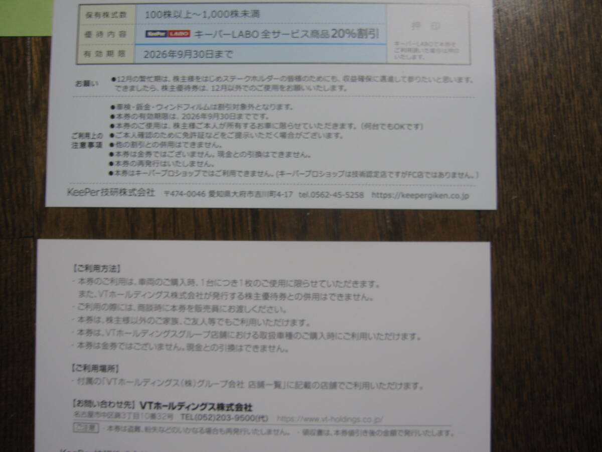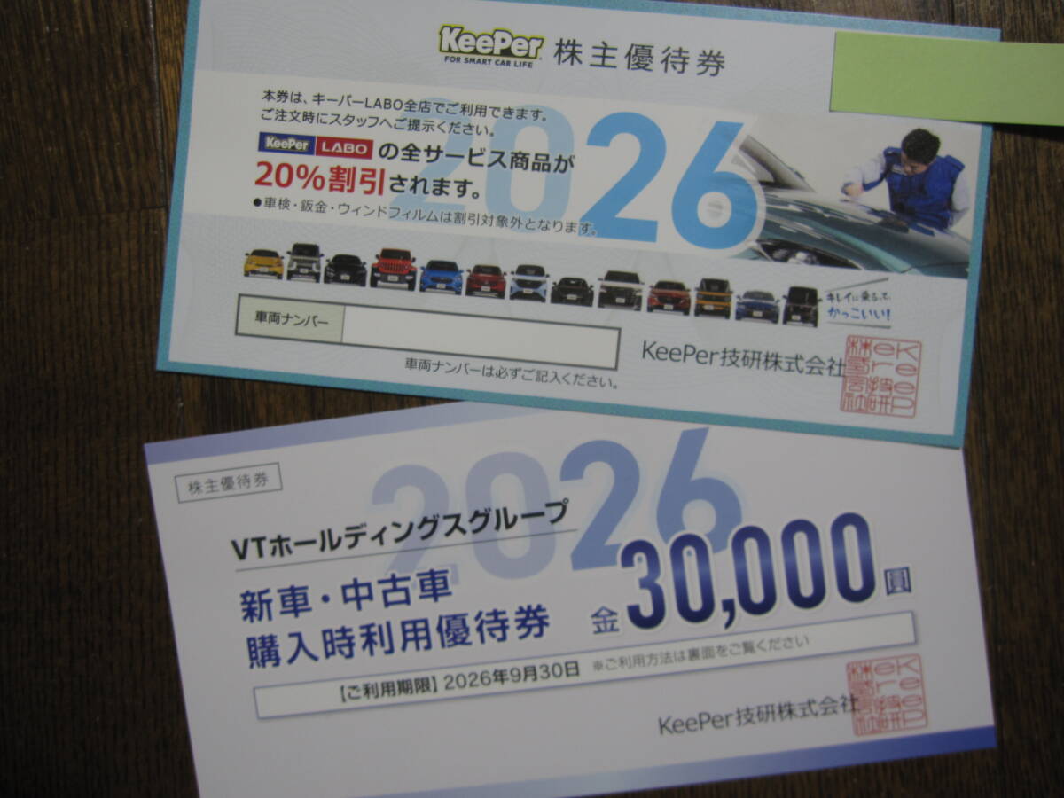 Keeper技研 株主優待 20%割引券 キーパーLABO+VTホールディングス新車、中古車購入時利用優待券30000円★有効期限2026年9月30日
