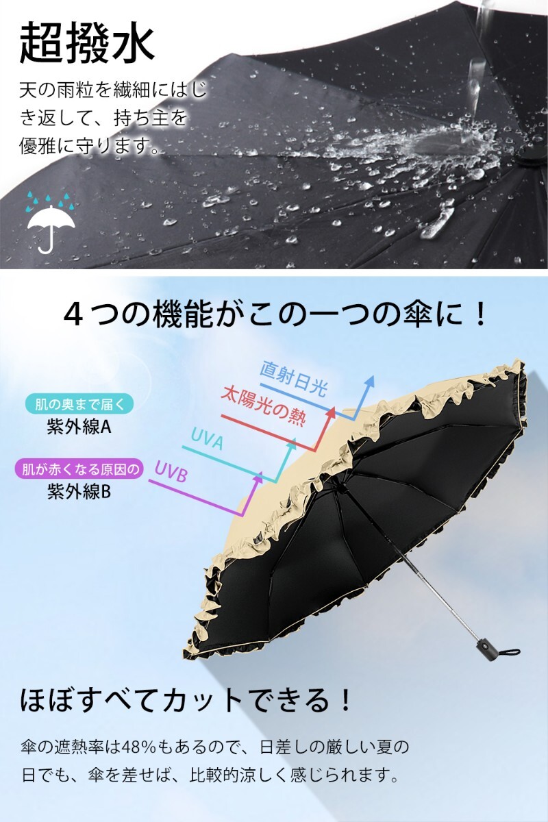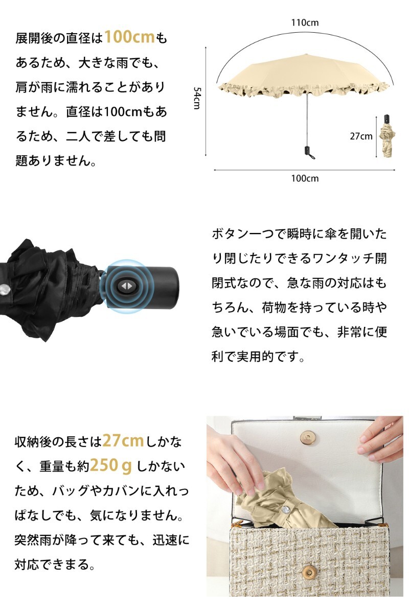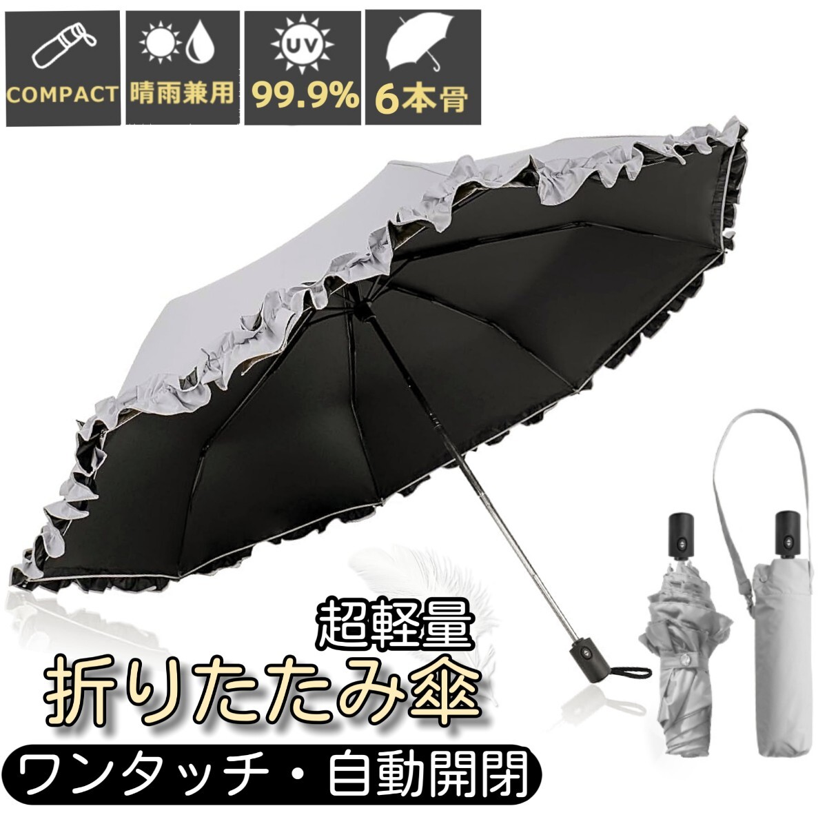 日傘 フリル付き 折りたたみ ワンタッチ 自動開閉 傘 完全遮光 100% 超軽量 折り畳み傘 6本骨 UVカット率 99.9% 紫外線対策 日焼け対策 レディース 大きめ 頑丈 超撥水 晴雨兼用 大きい おしゃれ 収納ポーチ付き