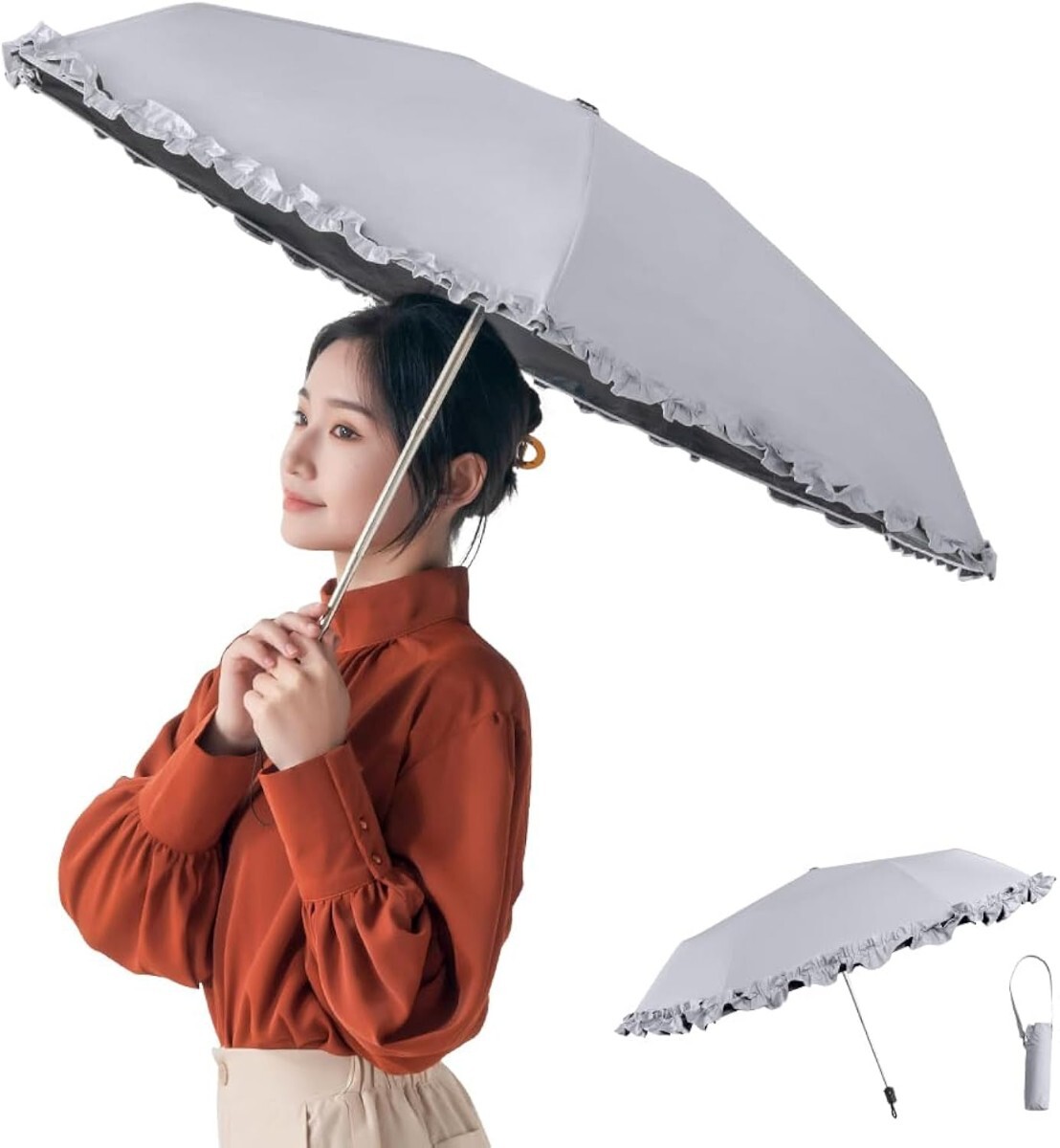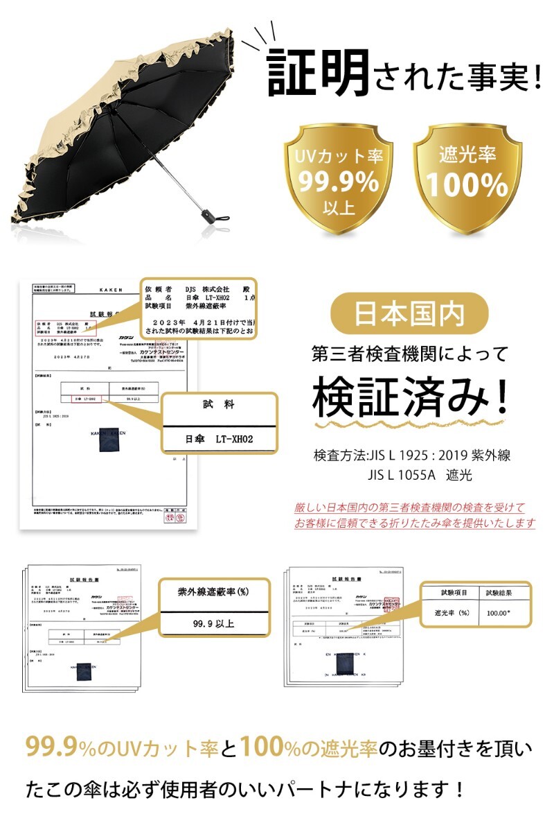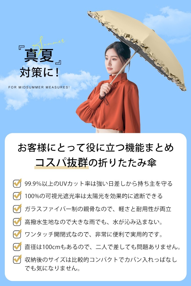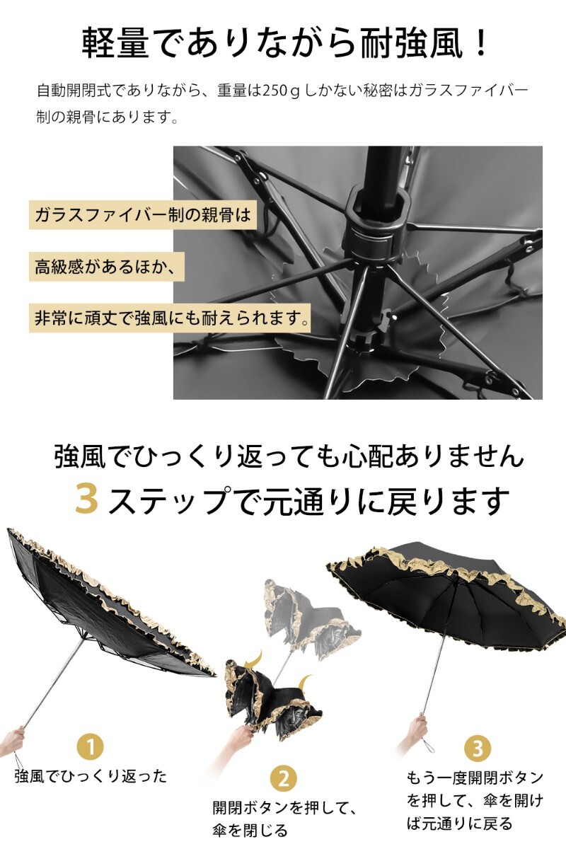日傘 フリル付き 折りたたみ ワンタッチ 自動開閉 傘 完全遮光 100% 超軽量 折り畳み傘 6本骨 UVカット率 99.9% 紫外線対策 日焼け対策 レディース 大きめ 頑丈 超撥水 晴雨兼用 大きい おしゃれ 収納ポーチ付き