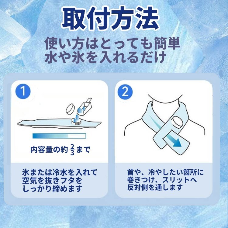 首や肩、ヒザなど冷やしたい部位にサッと巻くだけ。