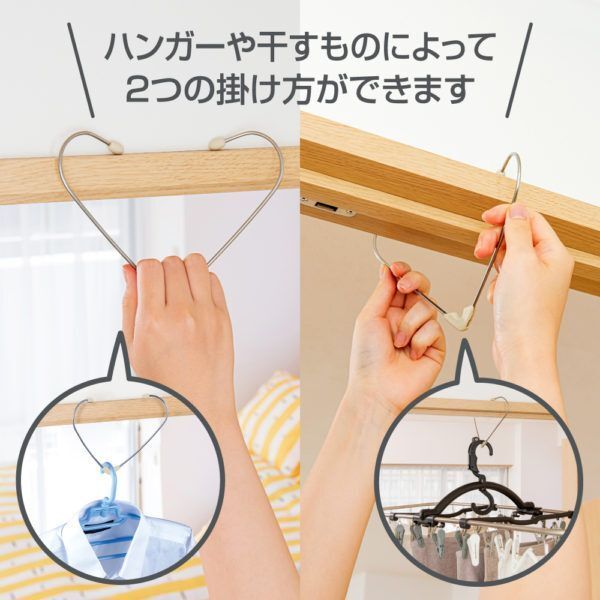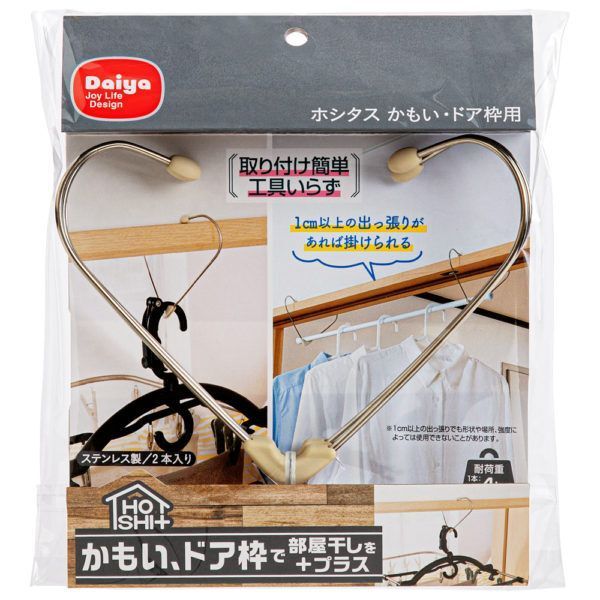 ・取り付け簡単、工具いらずで部屋干しスペースが作れるフックです。 ・かもいやドア枠に取り付けることで、角ハンガーやハンガーを掛けて部屋干しができます。 ・突っ張り棒を併用して、ハンガーをかけるスペースを作ることもできます。 ・壁面から1cm以上のでっぱりに取り付け可能。 幅が12cmまでのかもいに対応。 ※耐荷重は、1本につき4kgまで。 生産地 : 中国 サイズ : 本体サイズ(約):160×150×36mm 素材 : 本体:ステンレススチール キャップ・受け部:EVA樹脂 ブランド : ダイヤ |