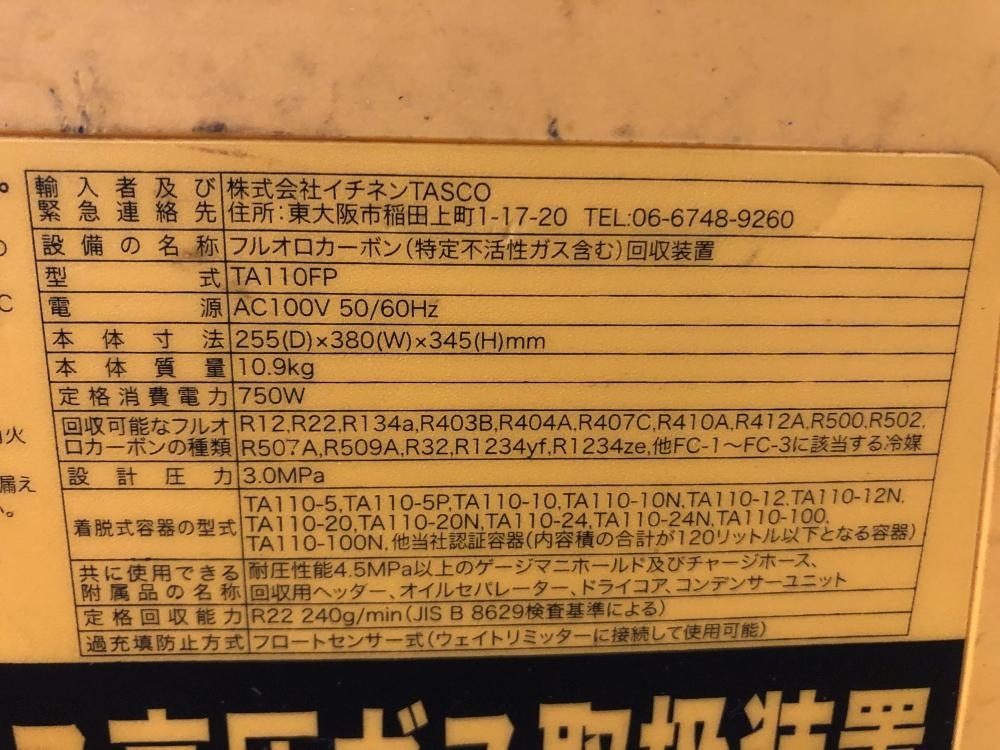 タスコ TASCO ■商品名 フロンガス回収機 ■型番 TA110FP |