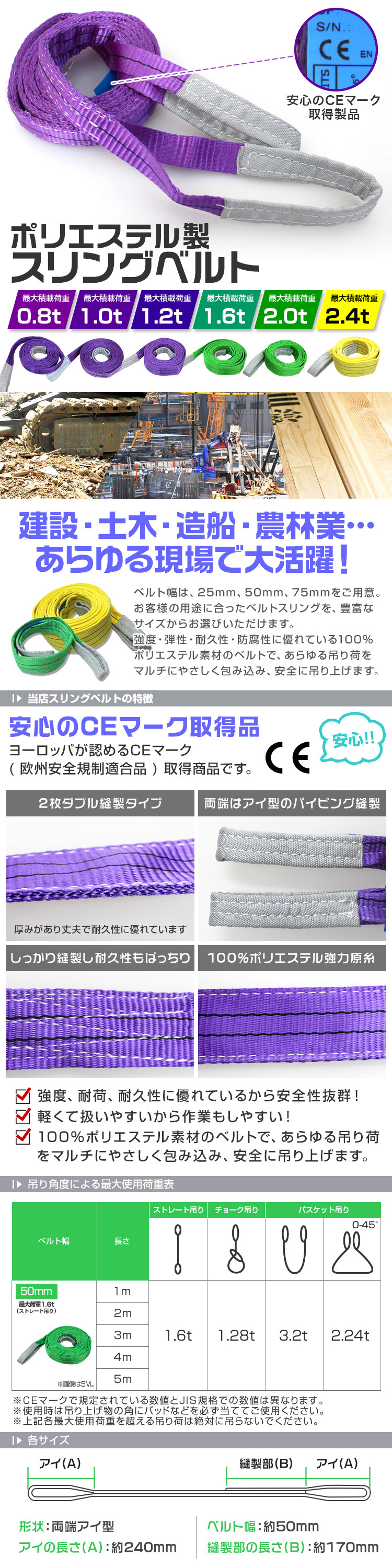 | 基本使用荷重1600kg(ストレート吊)/ 3200kg(バスケット吊)の荷役吊り上げベルトです。 ◎強度、耐荷、耐久性に優れているから安全性抜群 ◎軽いので扱いやすい ◎ヨーロッパが認めるCEマーク(欧州安全規制適合品) 取得商品 ◎ポリエステル100% ◎両端アイタイプ 運送業・自動車産業・建設業・倉庫業・造園業・港湾業・造船業・林業・石材業・荷役業など様々な作業にお使いください。 【仕様】 ベルトサイズ:長さ5m×幅50mm 材質:ポリエステル100% 最大使用荷重(能力):ストレート吊1600kg、チョーク吊1280kg、バスケット吊3200kg CE規格品 【内容】 ナイロンスリングベルト(耐荷1.6t 50mm×5m) ×1本 (スリングベルト ナイロンスリング ベルトスリング ナイロンスリングベルト 吊りベルト 吊り帯ベルト 荷吊りベルト 荷揚げ 荷締め ロープ 牽引 クレーンロープ クレーンベルト 運搬 おすすめ 送料無料) ※こちらの商品は元々伸縮性がある為、個体差がございまして長さに若干違いが生じることがございますが 返品交換の対象にはなりませんので、予めご了承ください。 |