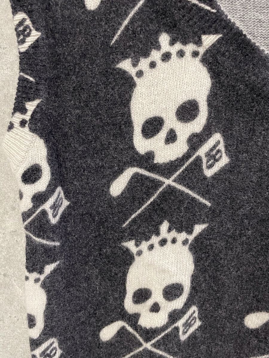 BIRDIE HUNT バーディハント ウール混 ニットベスト Vネック スカル総柄 ブラック系