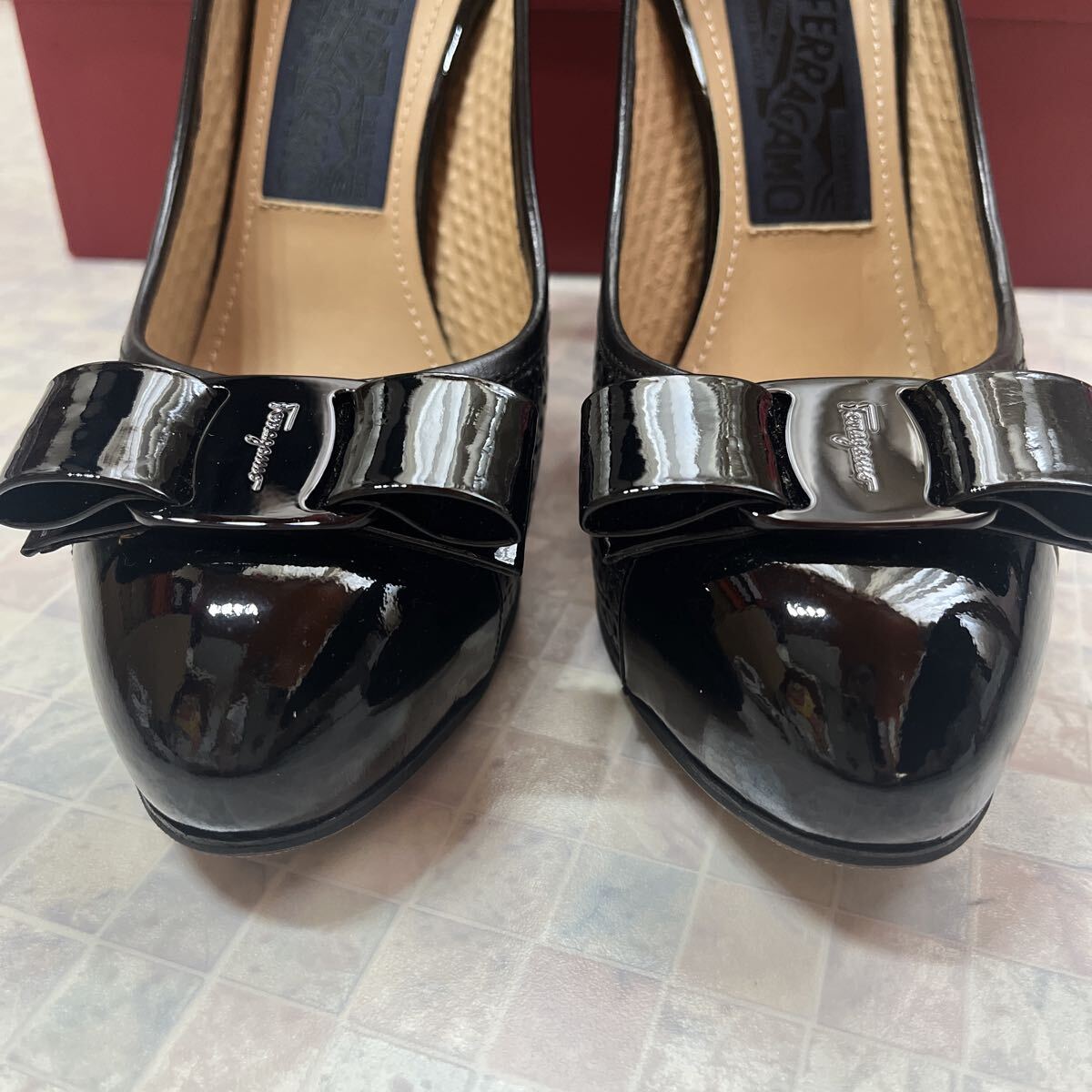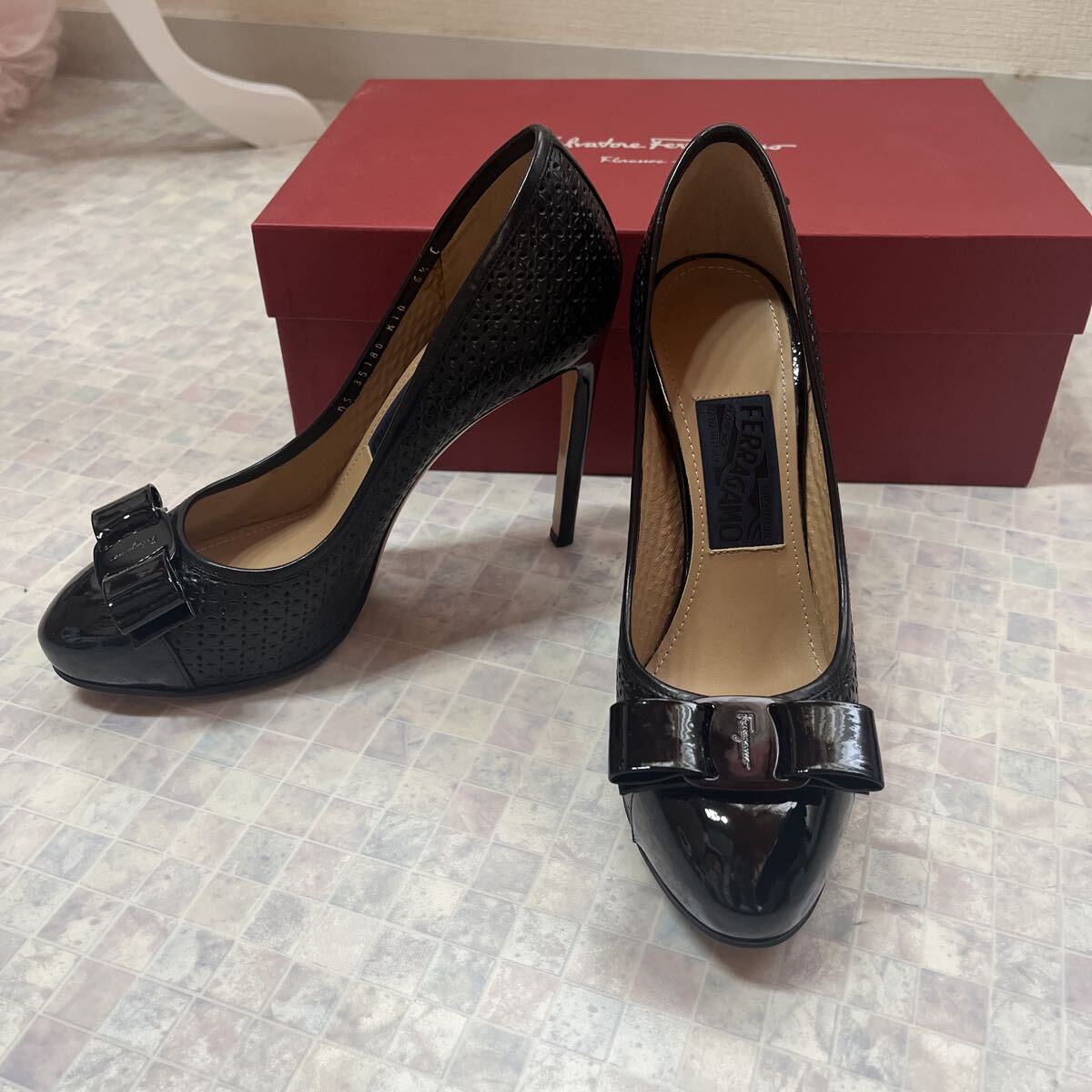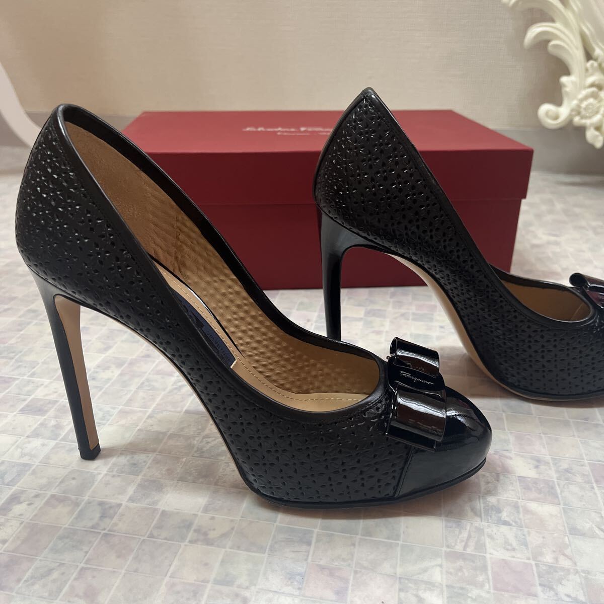 Salvatore Ferragamoのパンチングレザー×エナメルのパンプスです。