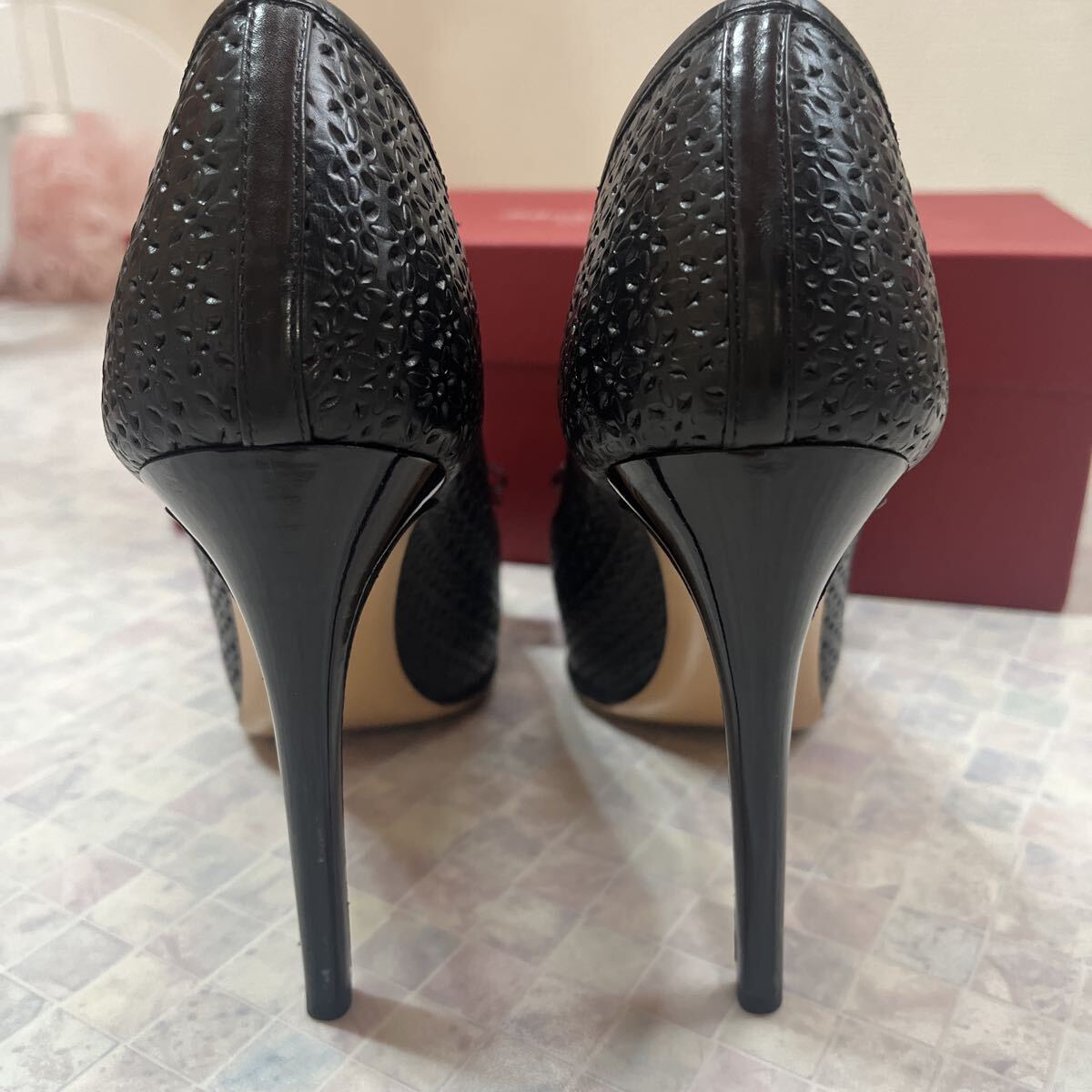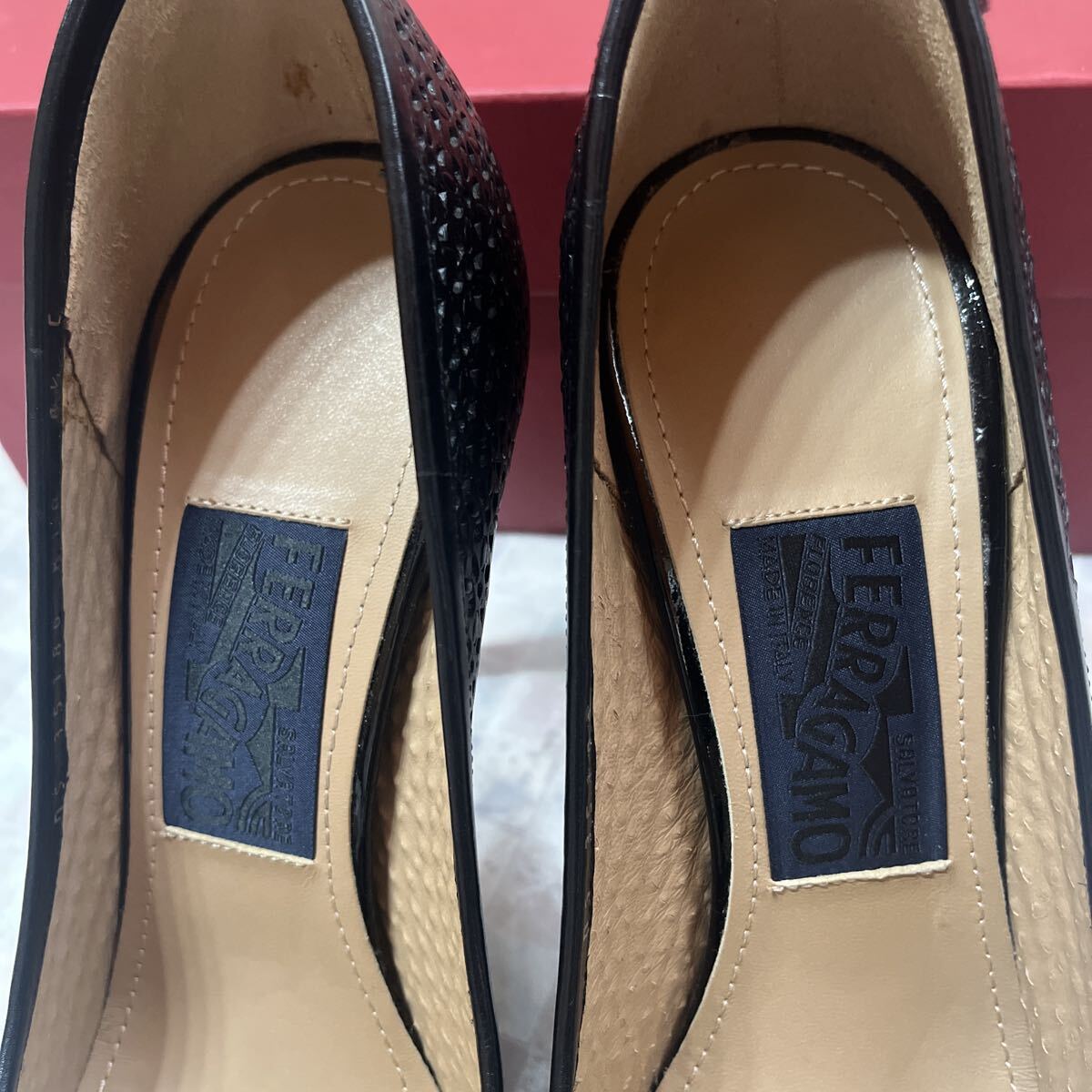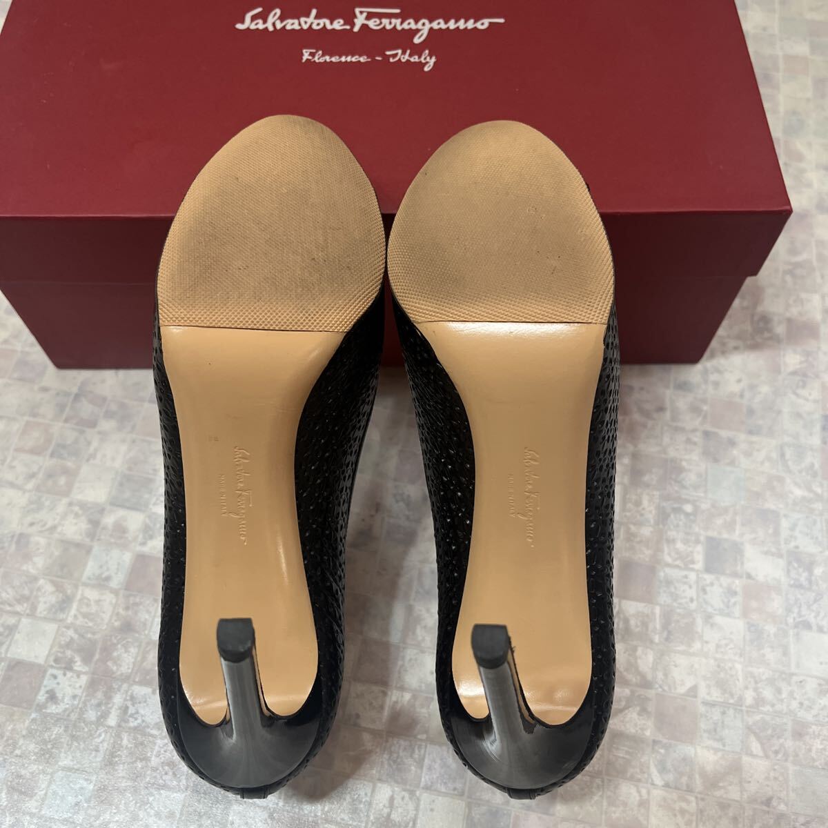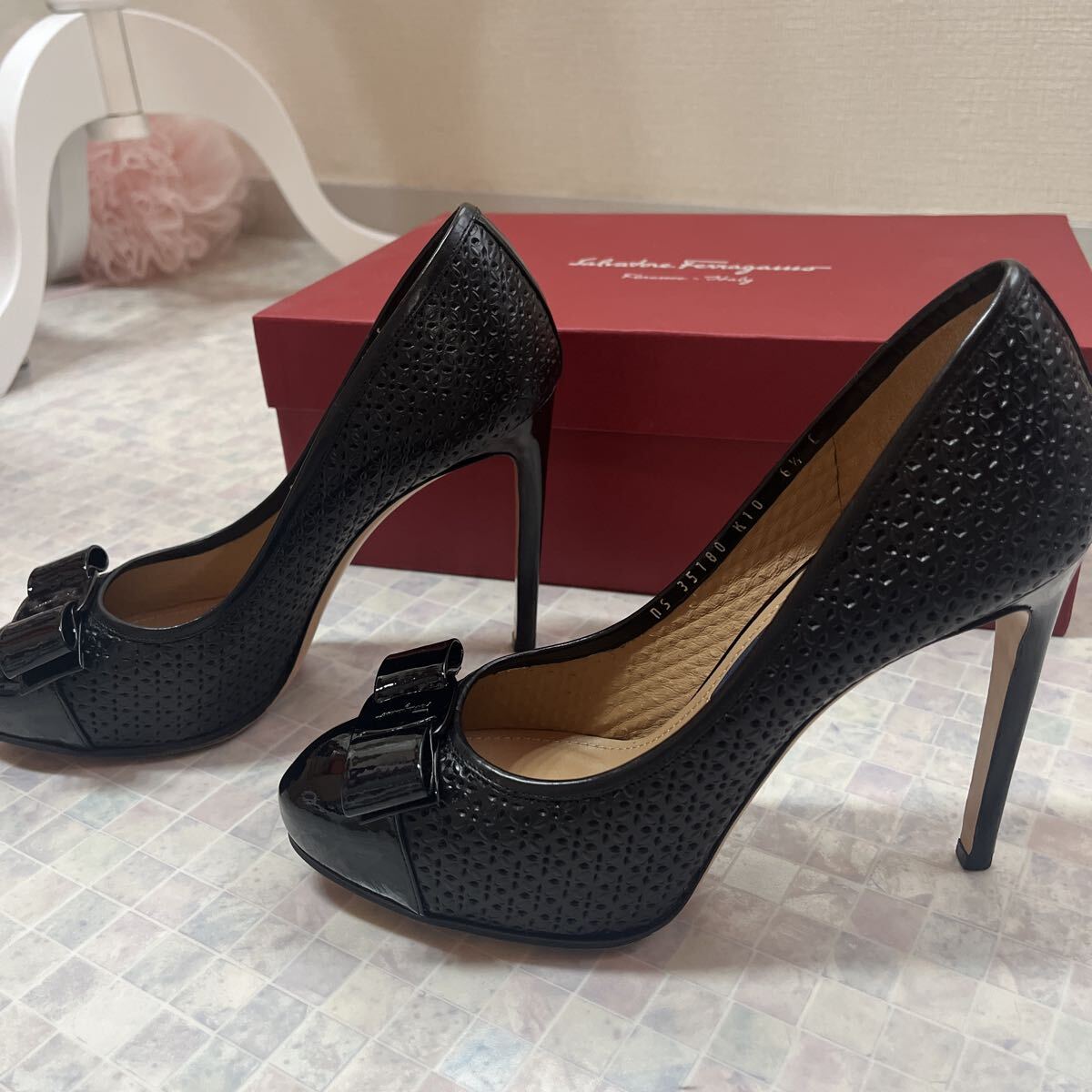 Salvatore Ferragamoのパンチングレザー×エナメルのパンプスです。