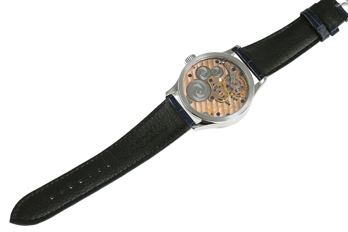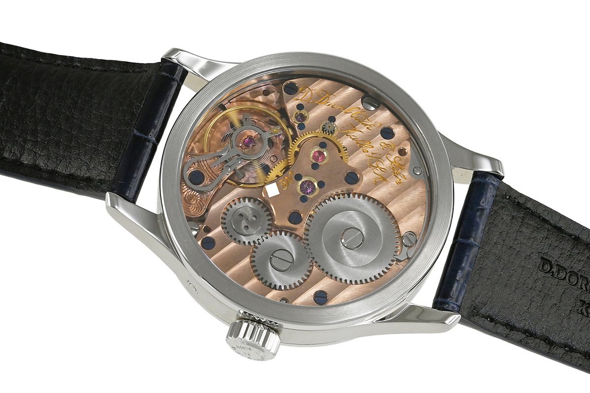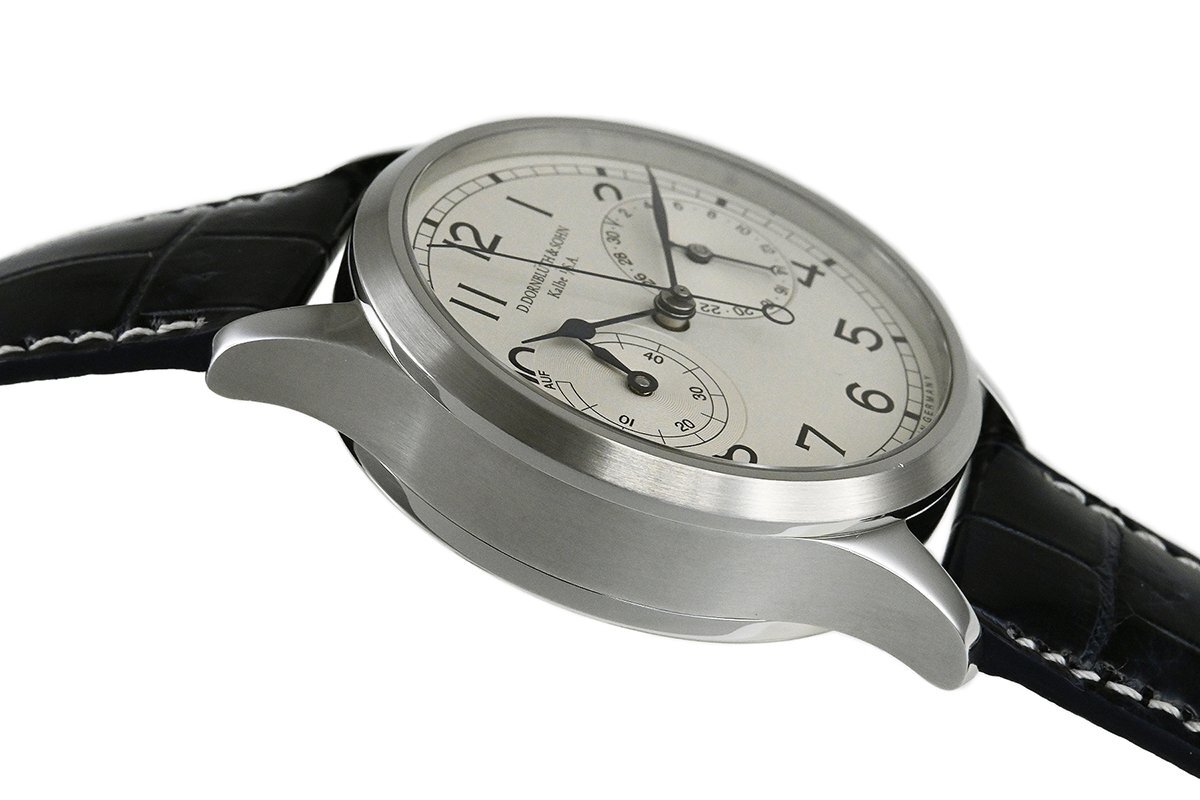 【コメント】 1999年創業、手作業での腕時計製造にこだわるドイツブランド「D.ドルンブルート&ゾーン」。ほぼすべてを手作業で行うため年間の生産量は100本程度と限られています。ベゼルエッジ35分位置辺りに小さな打痕があります。その他少々の軽い擦りキズはありますが目立つ様なキズはありません。革ベルトは未使用です。2025年1月に国内正規店にて購入品で、現在精度は平置きで日差+4秒程です。