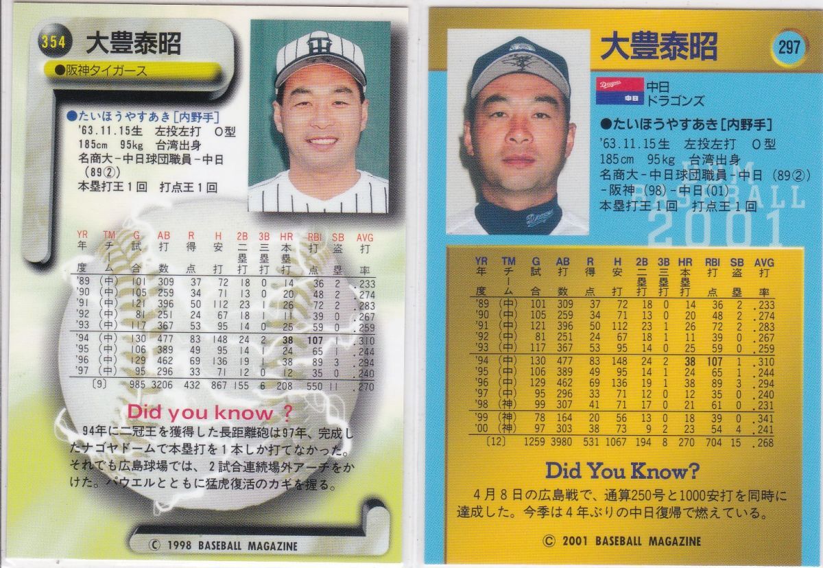 ●1998,2001BBM【大豊 泰昭】移籍:BASEBALL CARD No.354&復帰:297:阪神,中日