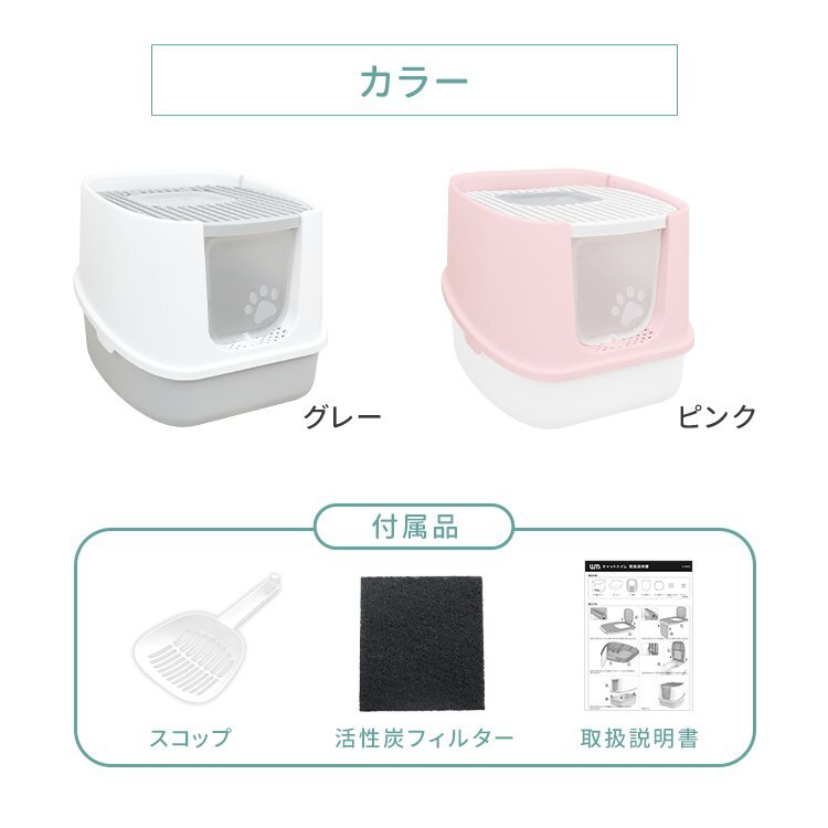 猫ちゃん用の可愛らしいトイレです。 猫ちゃんは潜ったり登ったりが大好き! 横だけでなく、上の穴からも出られる構造!! 遊び感覚で楽しみながらトイレを使えます。 ニオイが広がりにくい「扉付き」です。 さらにニオイを抑える活性炭フィルターケース付で、ニオイ対策もバッチリです!! 広々設計なので、大型の猫ちゃんでも快適にお使いいただけます! また、天板にも扉が付いており、出口を天窓のみに絞れば猫砂の飛散を防ぐことができます。 お手入簡単!上からフタを開けてお掃除できちゃう♪ お掃除には欠かせない、専用のスコップが付きで、使わない時は本体に掛けて収納可能☆ 【商品仕様】 カラー:グレー、ピンク サイズ(約):W45×H41×D51cm 重量(約):約1.8kg ※落札後、オーダーフォーム欄よりご希望のカラーをお知らせください。 未記入の場合・在庫切れの場合、ランダムに発送させていただくことがございます。 【商品内容】 トイレ本体 スコップ ヘラ 活性炭フィルター 取扱説明書 |