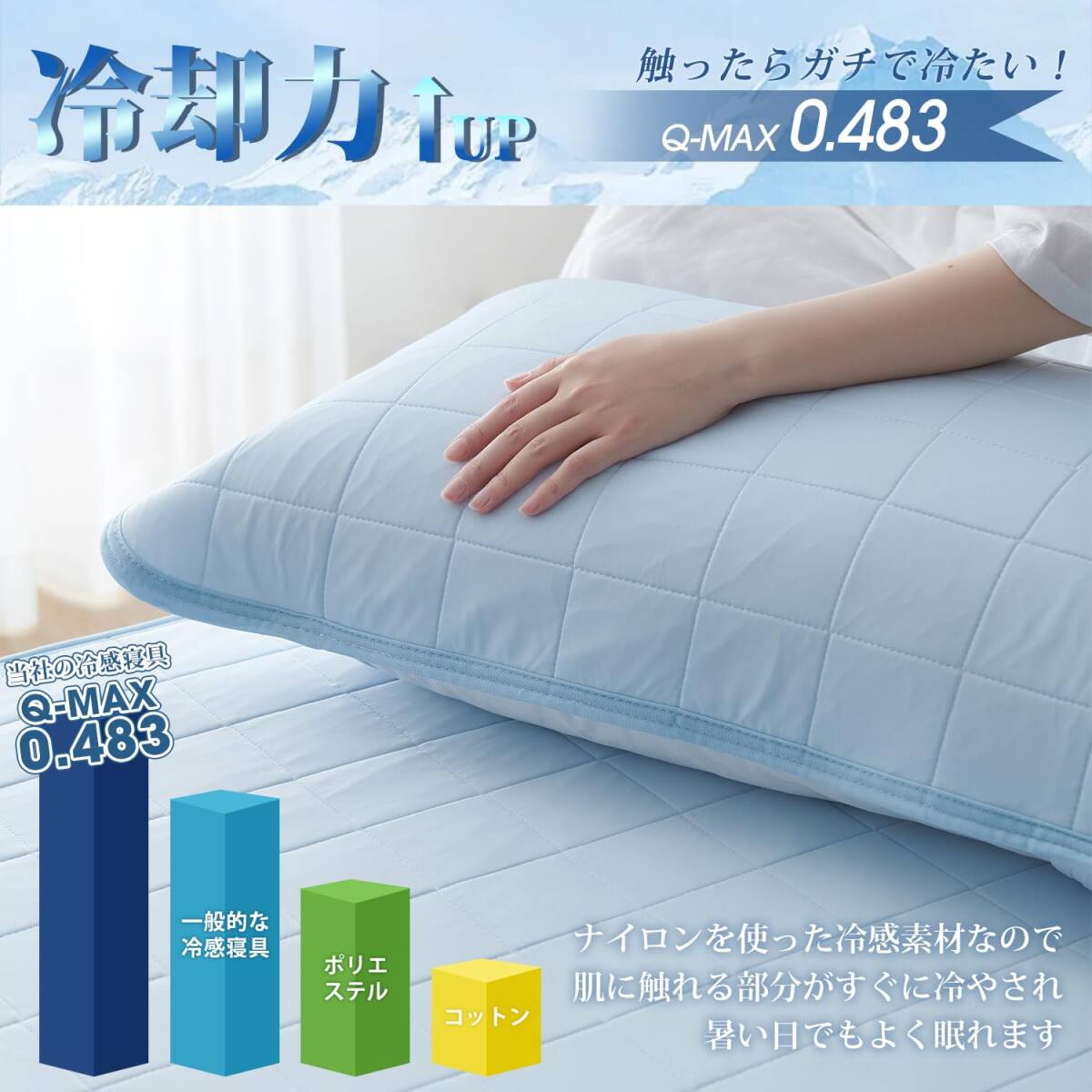 ・【ひんやり・すべすべ】表生地は毛玉になりにくいナイロンを使用した冷感生地です。Q-max値は0.483という高数値を記録した快適な冷たさで、寝返りを打つたびに「ひんやり感」が味わえます。クーラーと併用して使うとより効果を感じることができます。