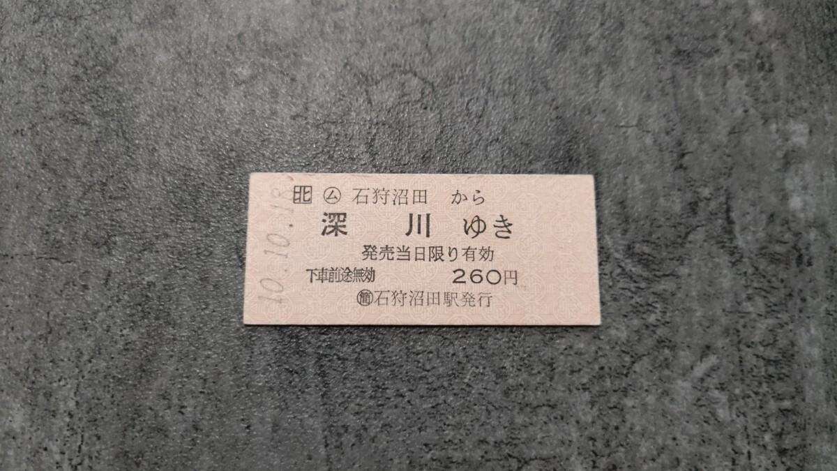 石狩沼田駅発行「石狩沼田→深川」硬券乗車券です。