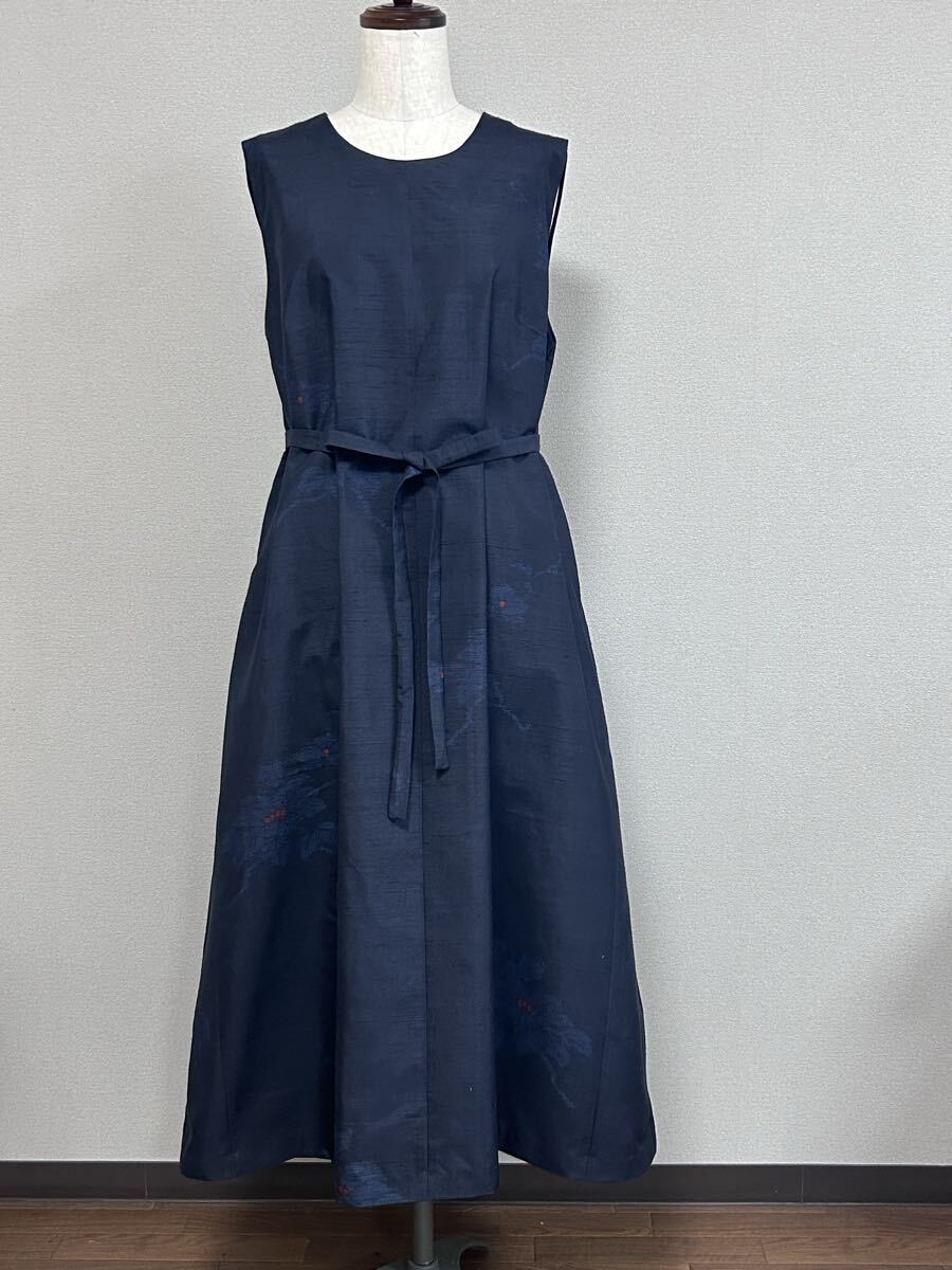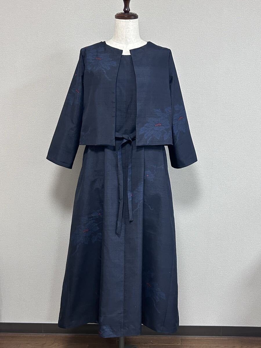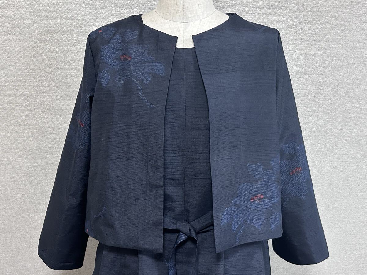 濃紺地に、可憐な花が散らされた、とても上品な紬を、シンプルワンピースとボレロのセットアップにリメイク致しました。