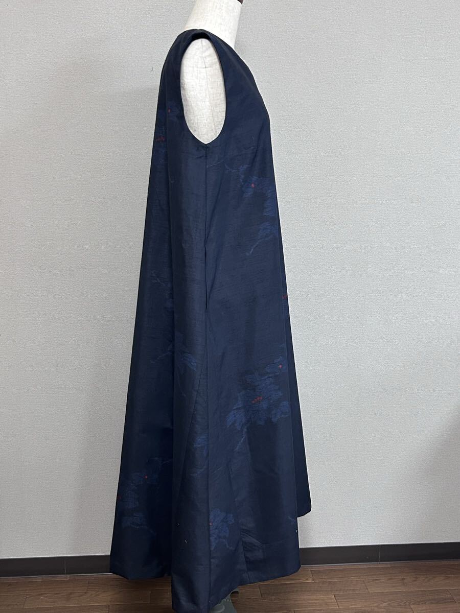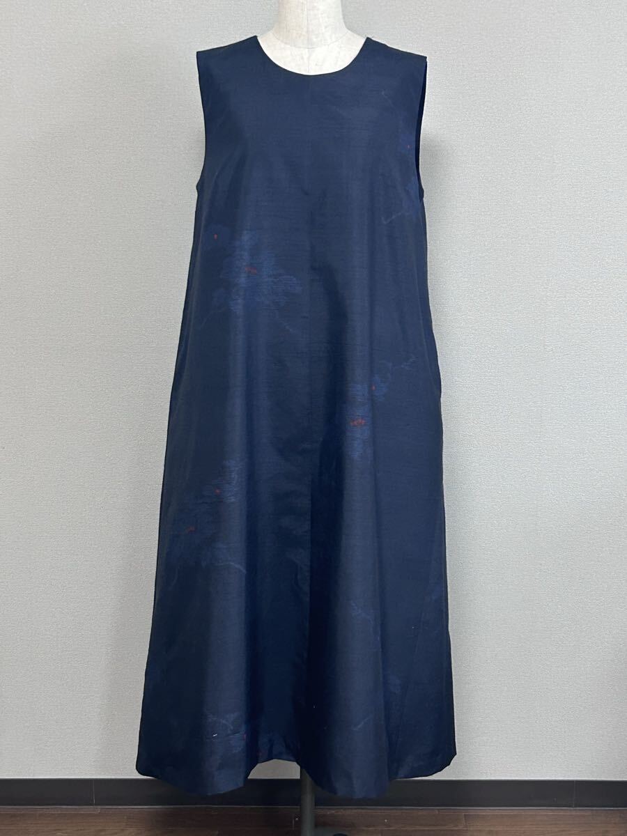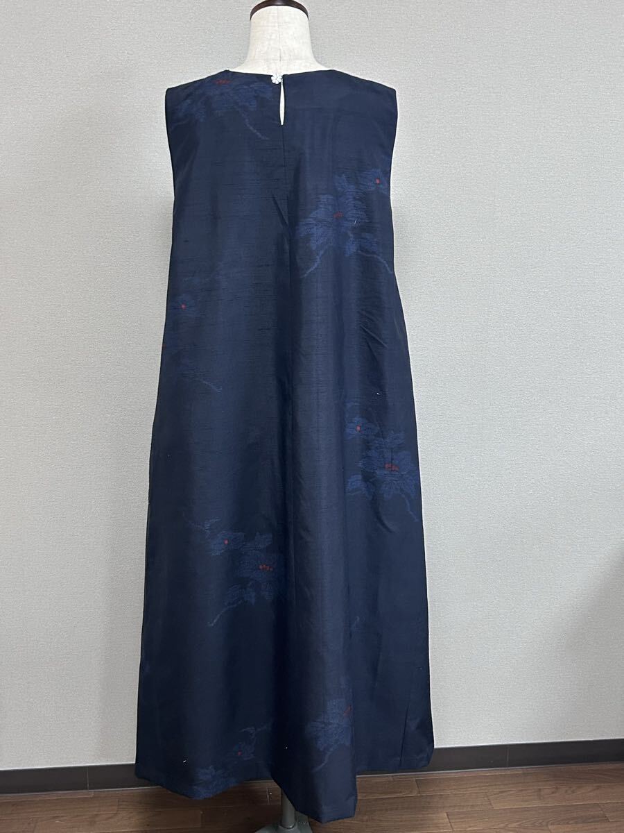 濃紺地に、可憐な花が散らされた、とても上品な紬を、シンプルワンピースとボレロのセットアップにリメイク致しました。