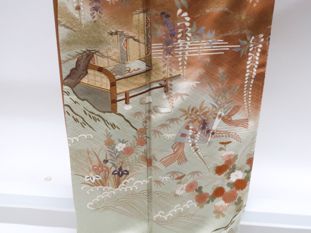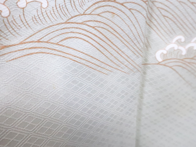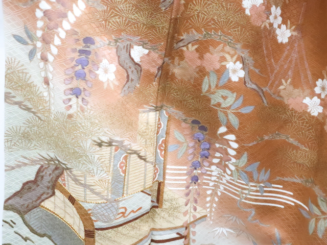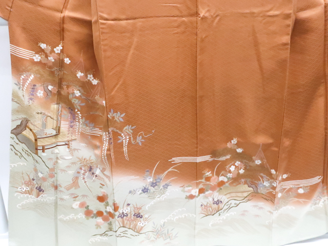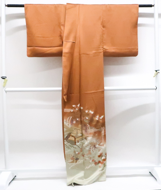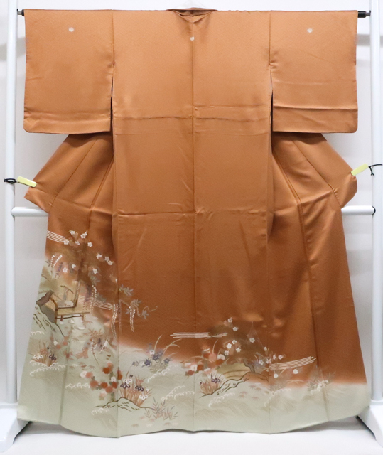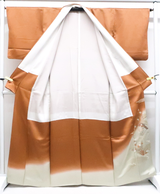 リサイクル商品のため、所々しみがございます。 左前袖に点汚れがございますが着用可能なお品です。 地色は茶です。 1枚目の画像が近いお色かと思われます。 素材は正絹です。 |
