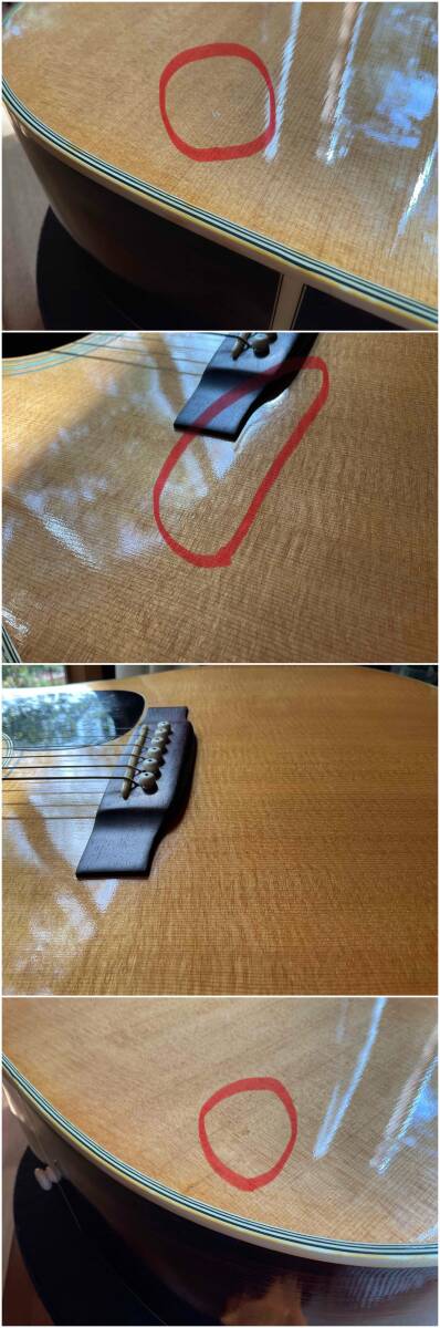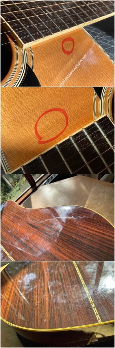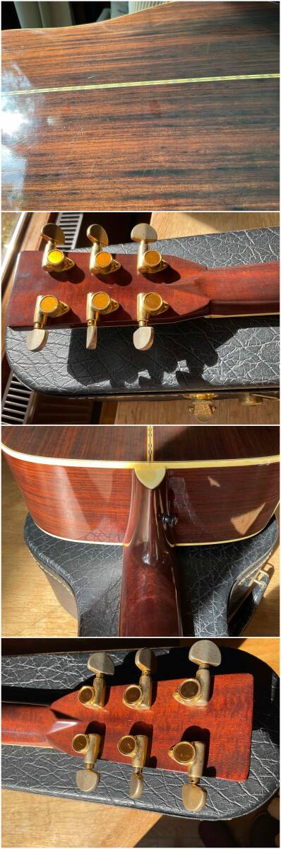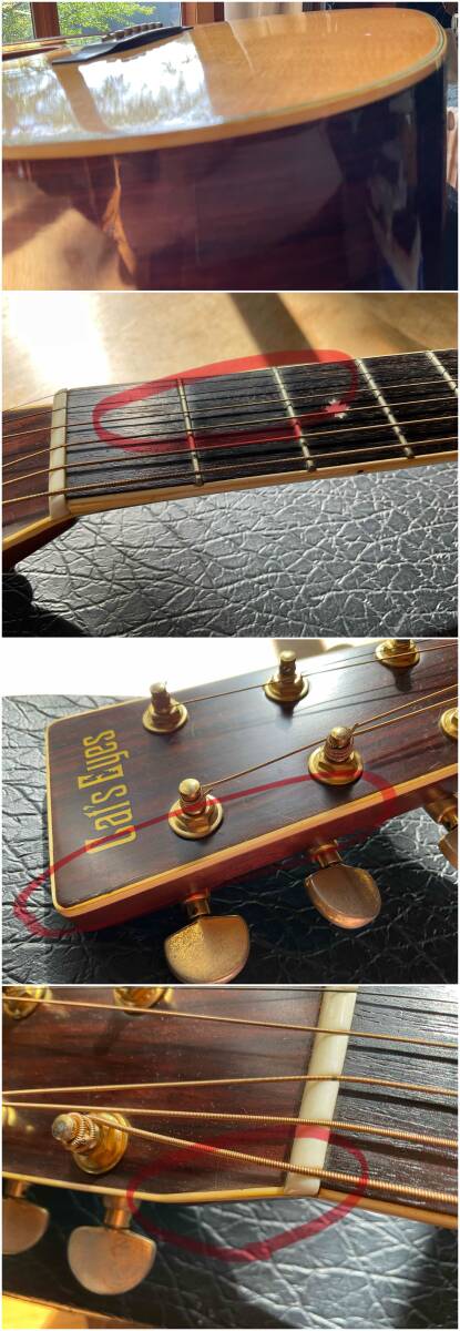 目立つ大きな傷有りませんがバック少し白濁、ヘッドツキ板横にヒビ、ヘッド表根元白濁、小打痕、ペグメッキ剥げ、指板へこみ少しあります。