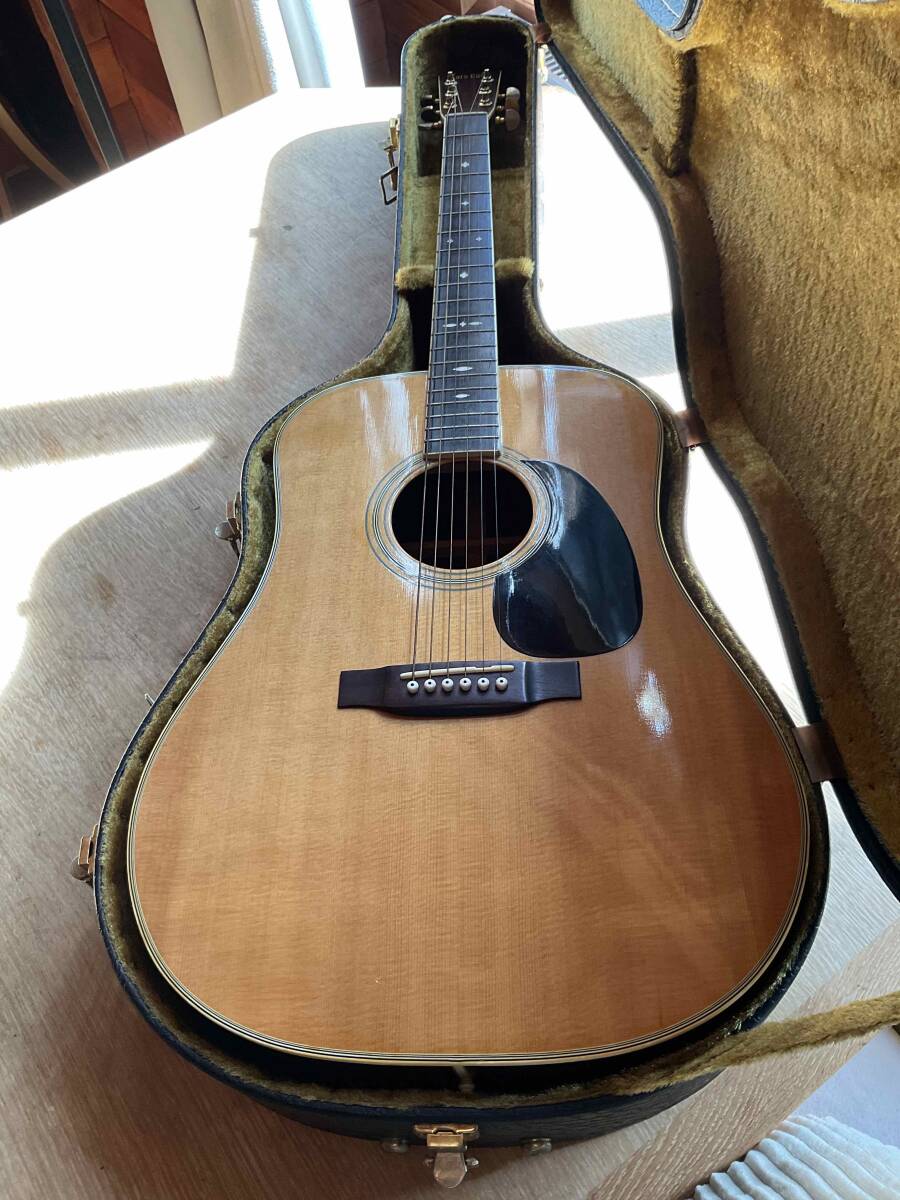 マーチンD-28のコピー。当時の定価5万円は大卒初任給が9万円の時代の5万円でしたので現在なら10万超えますね。