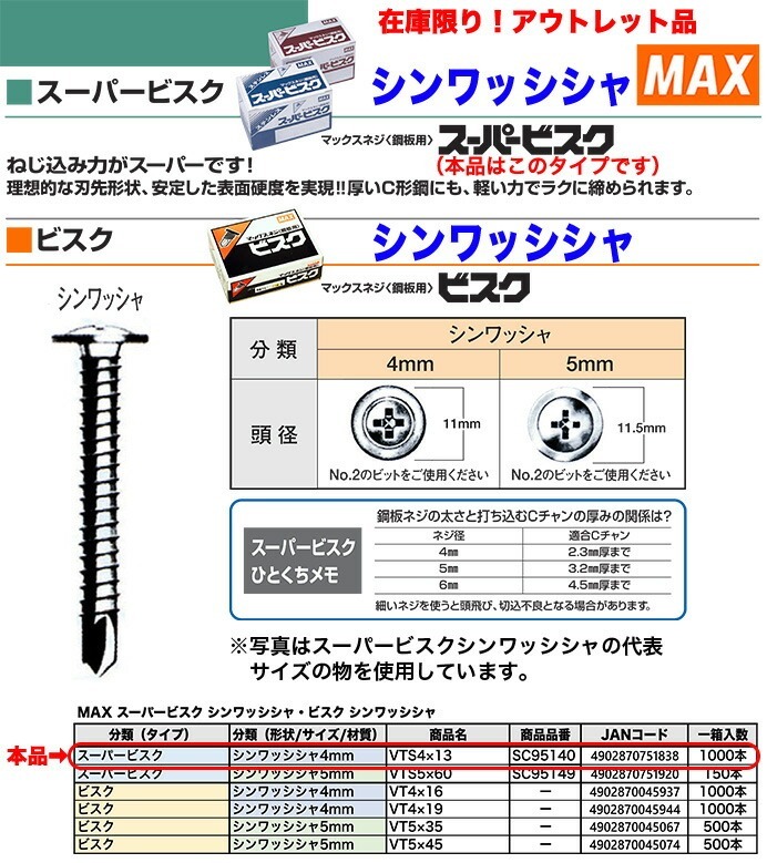 【在庫限り!アウトレット品】 〈MAX〉スーパービスク シンワッシシャ4mm VTS4×13 〔1箱・1000本入り〕 【オススメ】