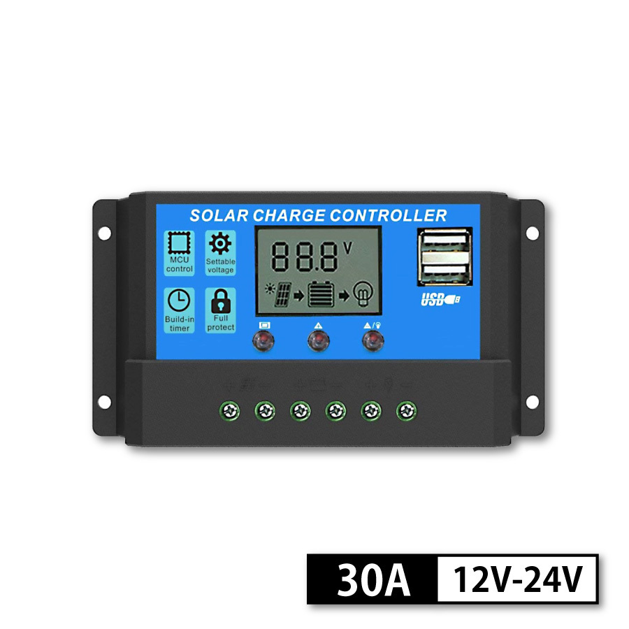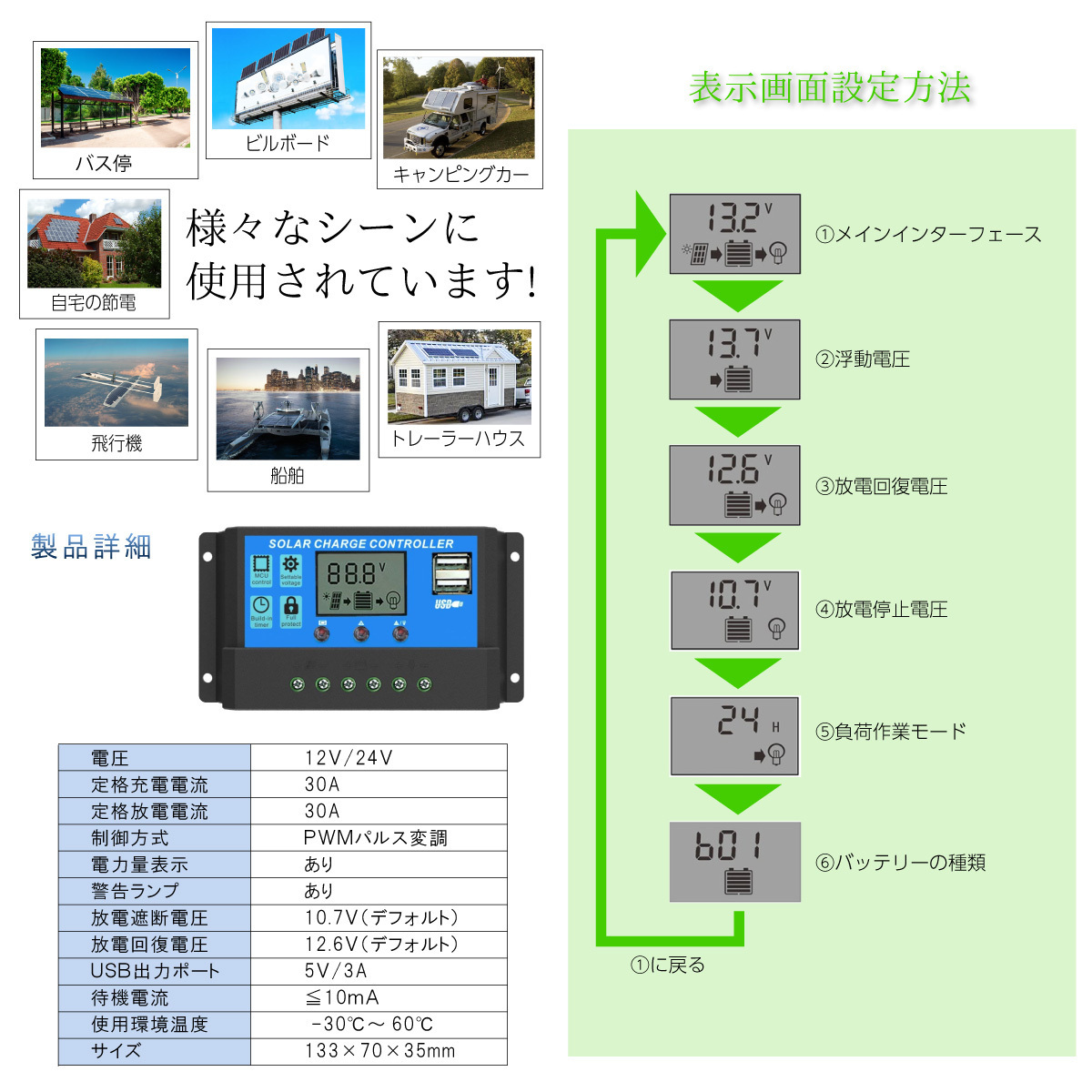 電圧 12V/24V 定格充電電流 30A 定格放電電流 30A 制御方式 PWMパルス変調 電力量表示 あり 警告ランプ あり 放電遮断電圧 10.7V(デフォルト) 放電回復電圧 12.6V(デフォルト) USB出力ポート 5V/3A 待機電流 ≦10mA 使用環境温度 -30℃~60℃ 使用可能蓄電池 鉛バッテリー(リチウム不可) サイズ 133×70×35mm |