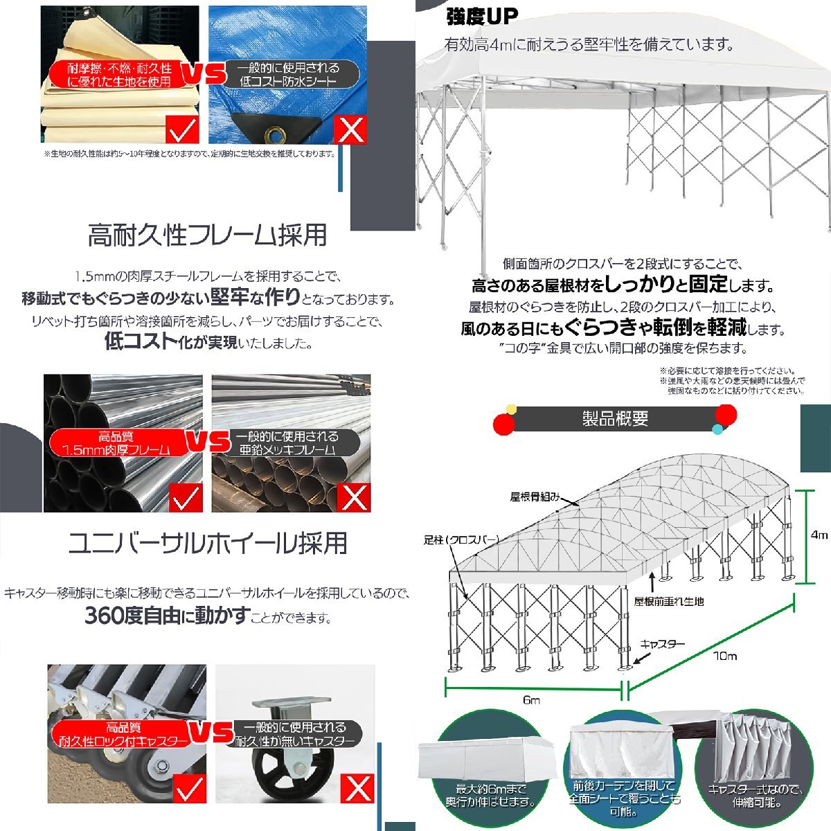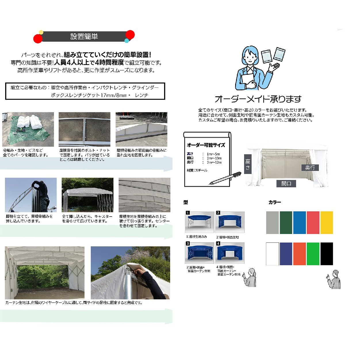 内容品 | 屋根生地/側面生地/カーテン生地/屋根前後垂れ生地 足柱(キャスター付き)/屋根骨組/ボルトナット カーテン用ワイヤーケーブル/タッピングビス/ 取扱説明書 |