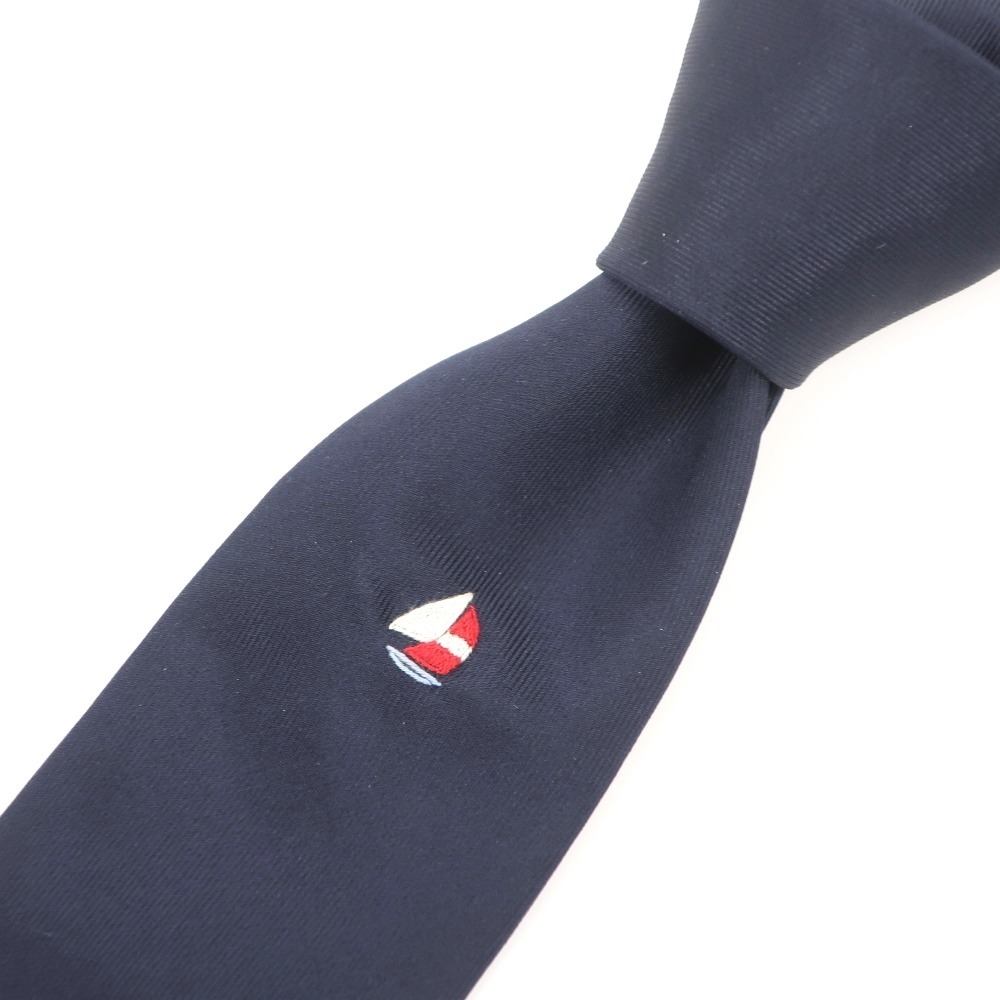 ノット下にくる位置にヨット柄のワンポイント刺しゅうが施された、ツイル織りシルク生地を使用したネクタイです。仕立ては裏地付きの3つ折り仕立てで、職人による丁寧な手仕事が感じられる1本に仕上がっています。