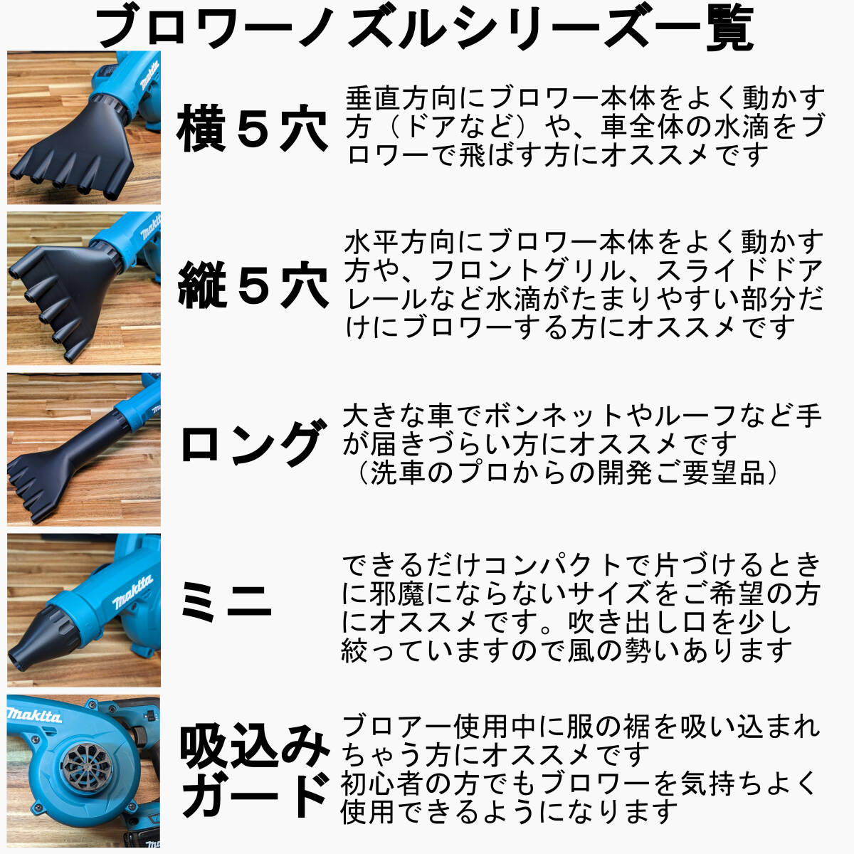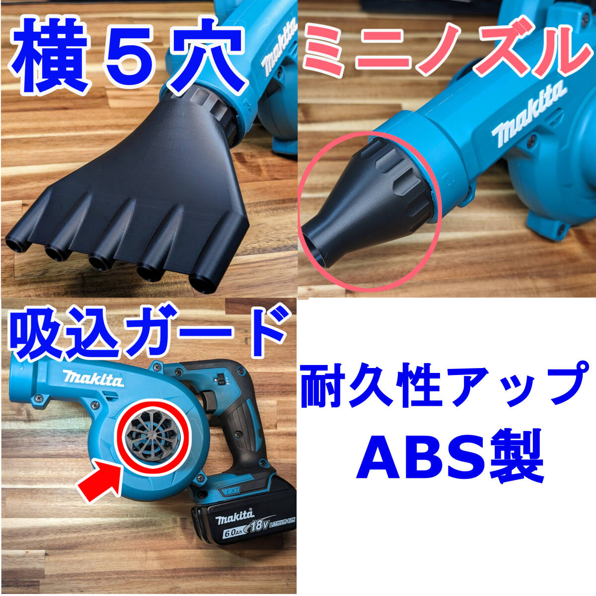 マキタブロワー用ノズルセット(横5穴、ミニ、ガード) ABS製