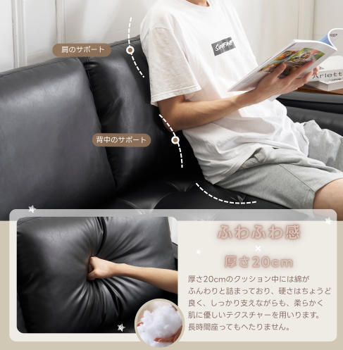 • ★【ふっくら厚みのある背もたれ(約20cm)】背もたれには十分な厚さのウレタンフォームをたっぷりと充填。やわらかく体を包み込み、長時間座っていても快適です。