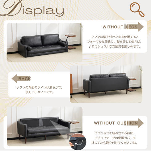 • ★【ゆったりとした3人掛けカウチ】:余裕がある座り心地。十分に3人掛けとしてのサイズを持ちます。 お部屋の広さが許されれば、出来るだけ大きいサイズのソファを置くことが出来ますが、限られたスペースの中でコンパクトに場所を取らず、またお部屋の圧迫感を軽減し空間を広く感じさせられる、そんなお望みには3人掛けのソファがおすすめです。