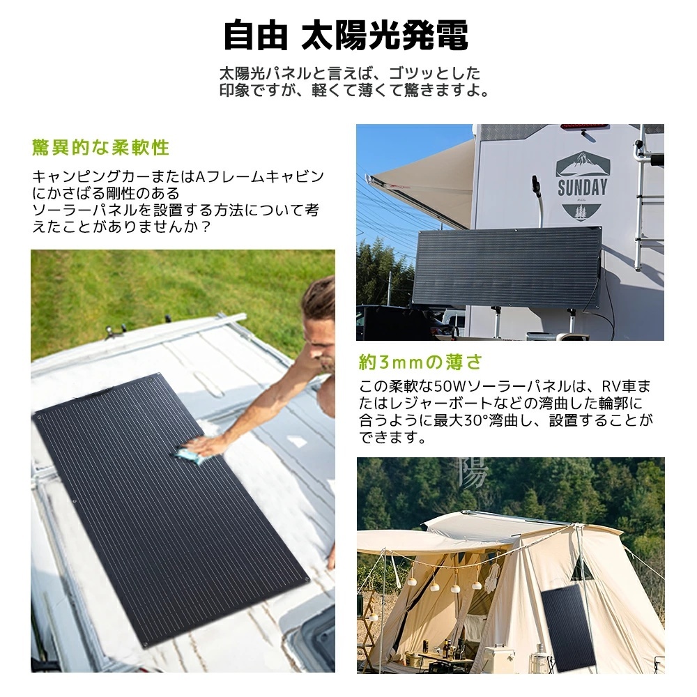 5,「設置が柔軟」 最大50度の湾曲させる事が可能なこのソーラーパネルは、キャンピングカー、ヨット、Aフレームキャビンなどの曲面場所に使用することが可能です。さらに、製品には合計4つの接続取付穴が取付され、この柔軟なソーラーパネルを簡単に固定できるように加工されています。