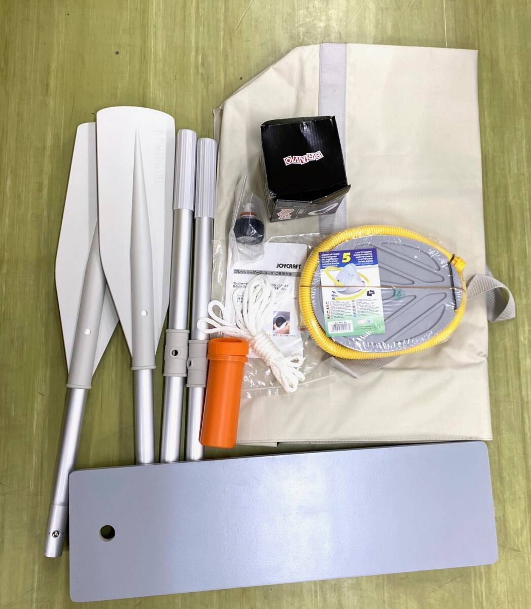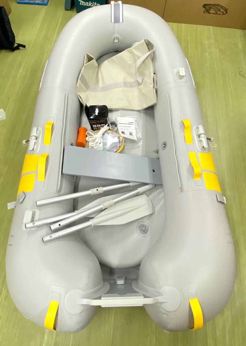 付属品:アルミオール、フットポンプ、キャリーバッグ、リペアーキット、腰掛板1枚、プレッシャーゲージ、電動ポンプMB-50(このポンプは規定圧まで入りません。最後はフットポンプをお使いください。)