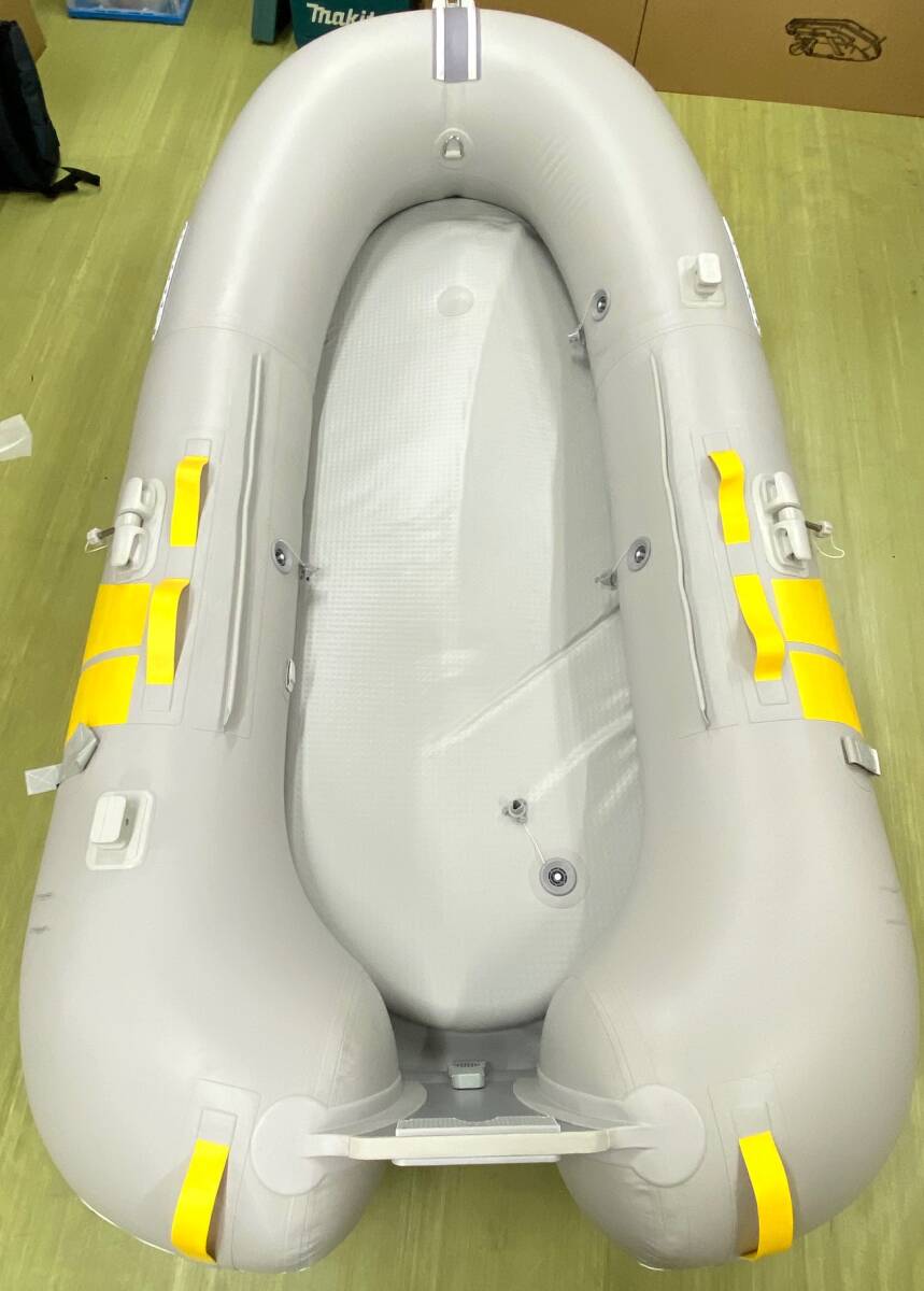 組み立てはエアーの注入のみでOK,マット底で底板並みの安定感です。船外機の重量を受けるトランサム部分の後部チューブを太くし安定性を確保しています。