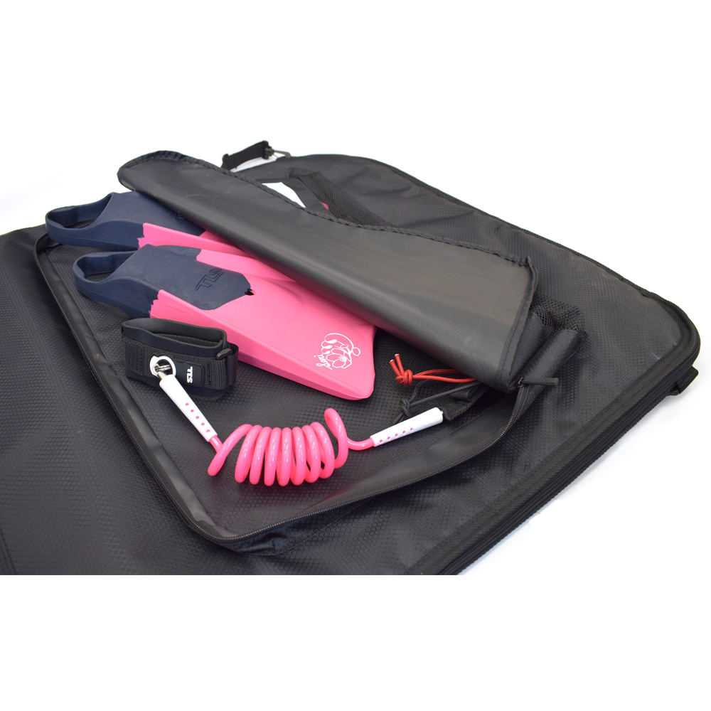 【 TLS BB 2 in ONE HARD CASE|BB用ハードケース 】 ボディーボード2枚収納可能なハードケース ■ 商品説明 ・2本までのボードを収納可能 ・8mm厚フォーム ・強靭なナイロンファブリック ・壊れにくいジッパープル ・柔らかく持ちやすいハンドル ・背負えるバックストラップ ・メッシュ付き大型ポケット ■ サイズ(約) 1170×700mm