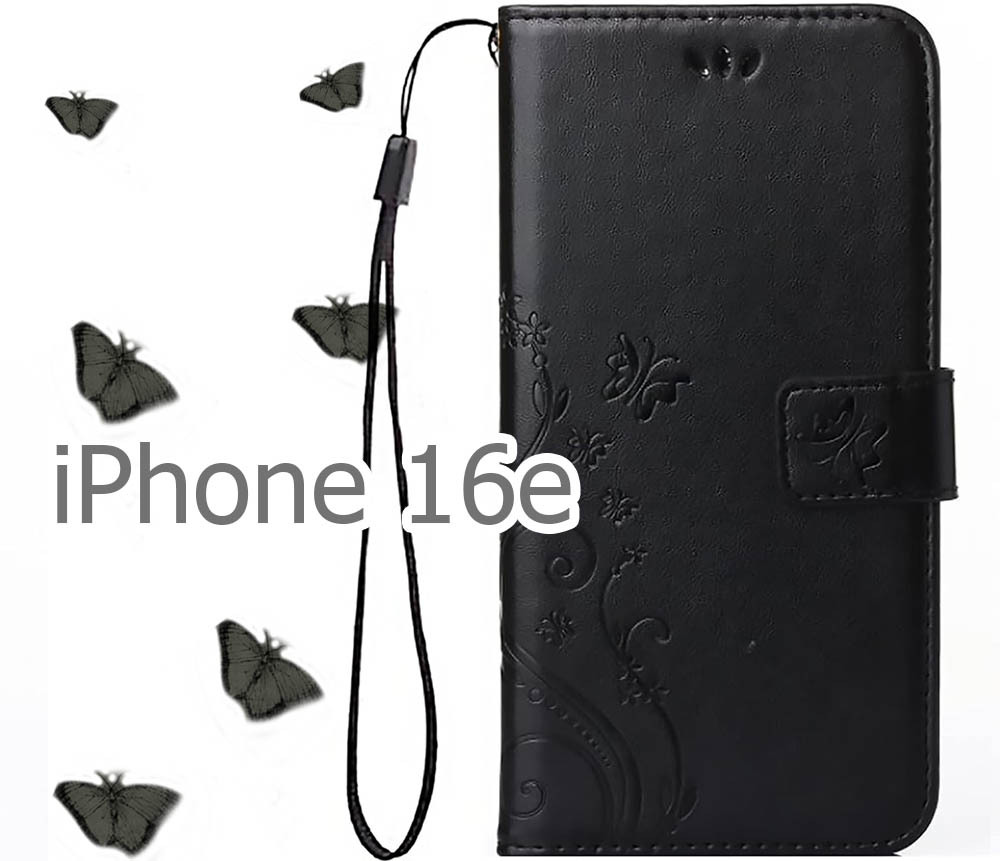 iPhone16e ケース 手帳型 iPhone 16e カバー アイフォン16e 黒 ブラック 蝶 バタフライ 花 レザー 革 おしゃれ スマホカバー 送料無料 安い