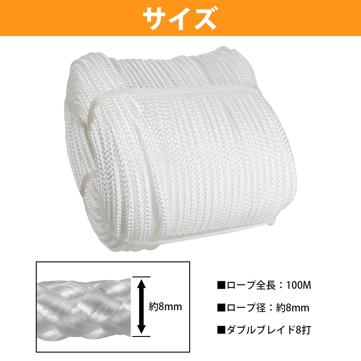 【送料無料】8打 8mm 100m 係留ロープ フェンダーロープ ダブルブレイド 白/ホワイト マリン ロープ 船 係船 ロール 8ミリ アイ加工無