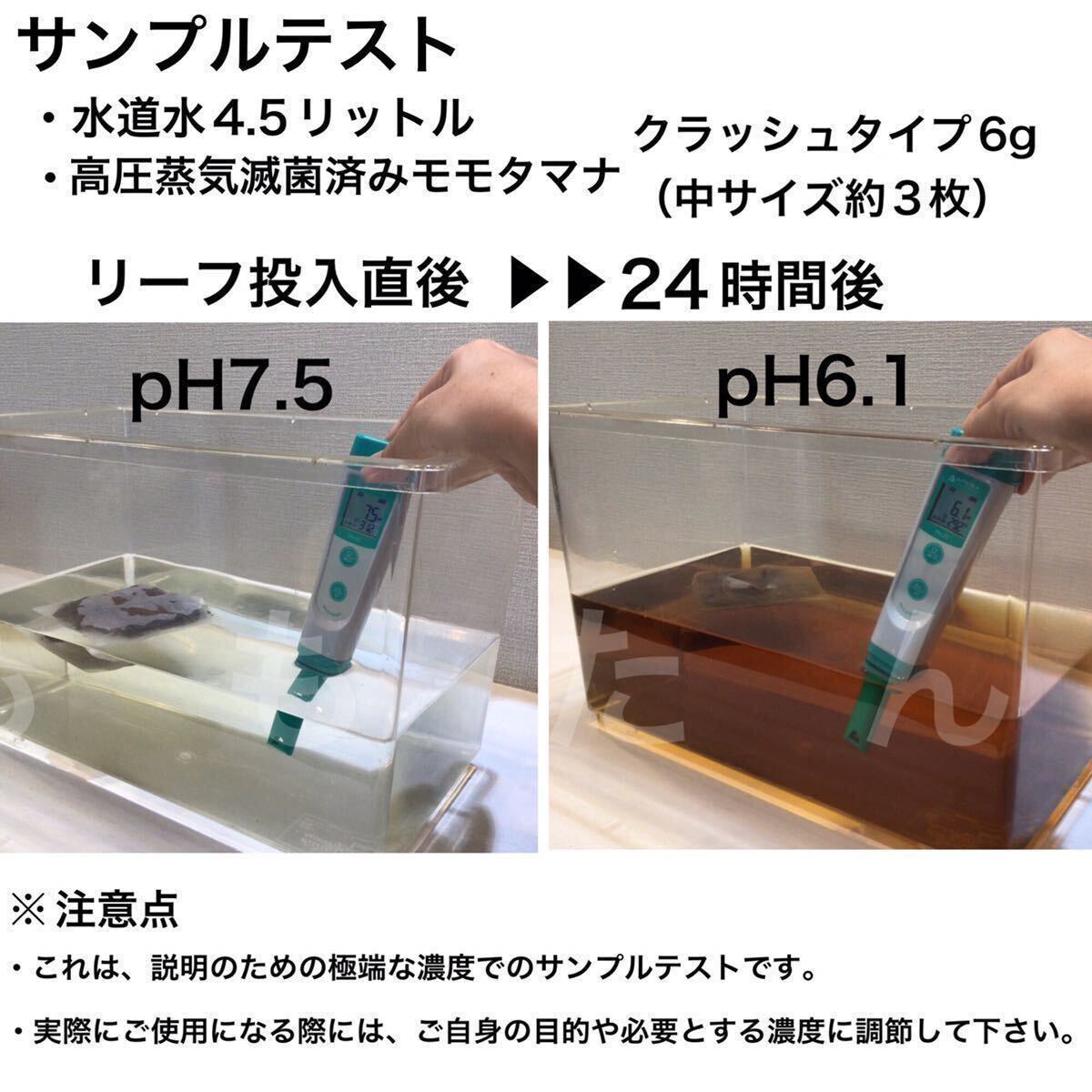 ・リーフは最初は水に浮かんでおり沈むのに数日かかります。そのため、早く沈めたいのであれば何か重しをのせるか、または換え水に先に浸しておくと良いと思います。