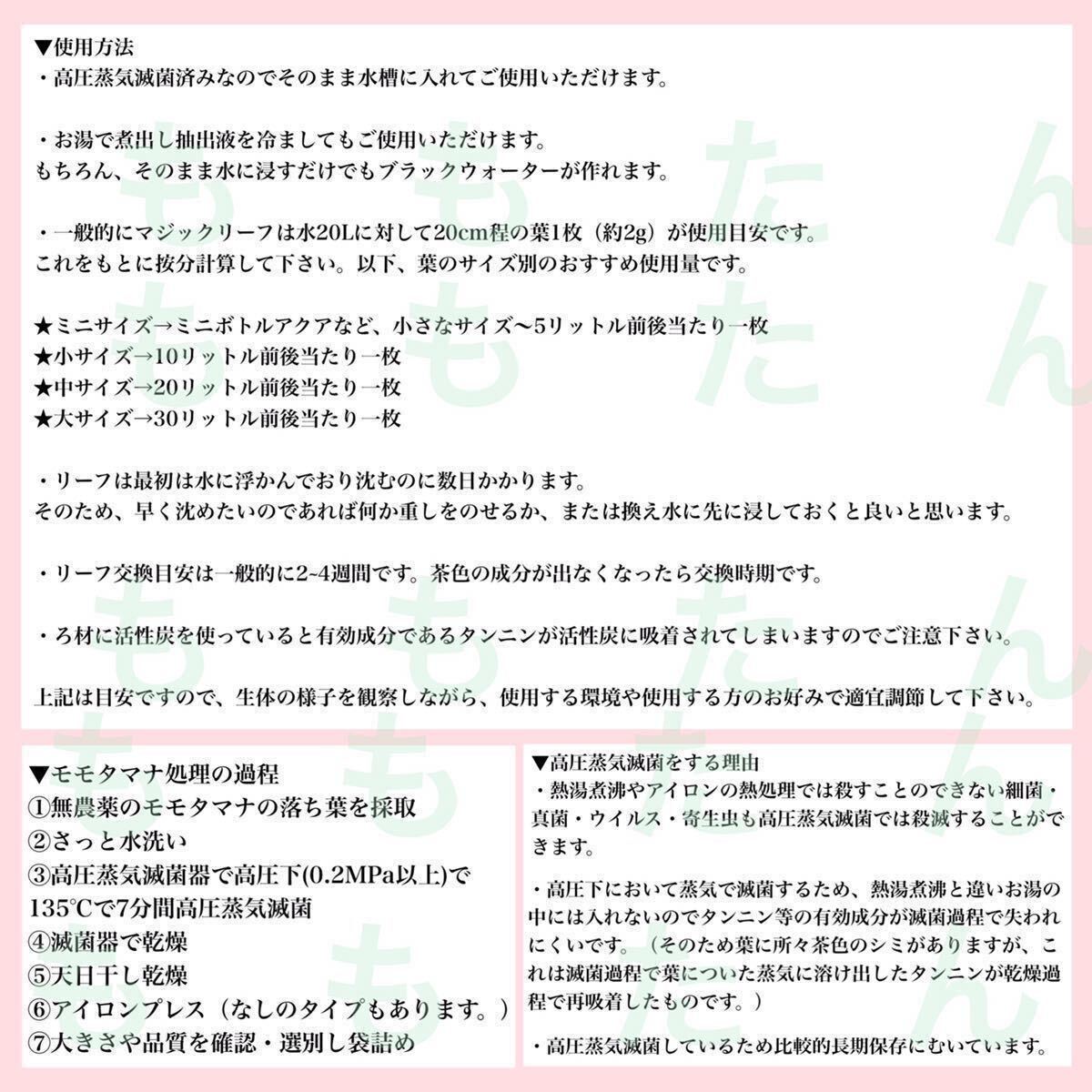 ※調べた限りでは国内で高圧蒸気滅菌済みのモモタマナ(マジックリーフ)を生産・販売しているのは、当方だけです。 しかし現在、当方の商品説明文を無断転載してマジックリーフを販売している方がいます。当方とは全く関係ありませんのでご注意下さい。