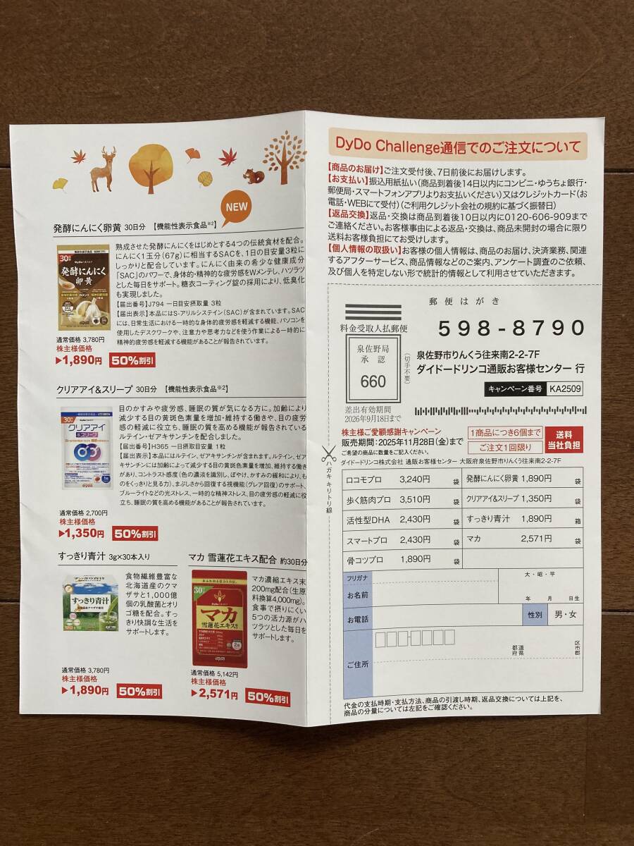 ①サプリメント50%割引のチラシ兼注文ハガキ