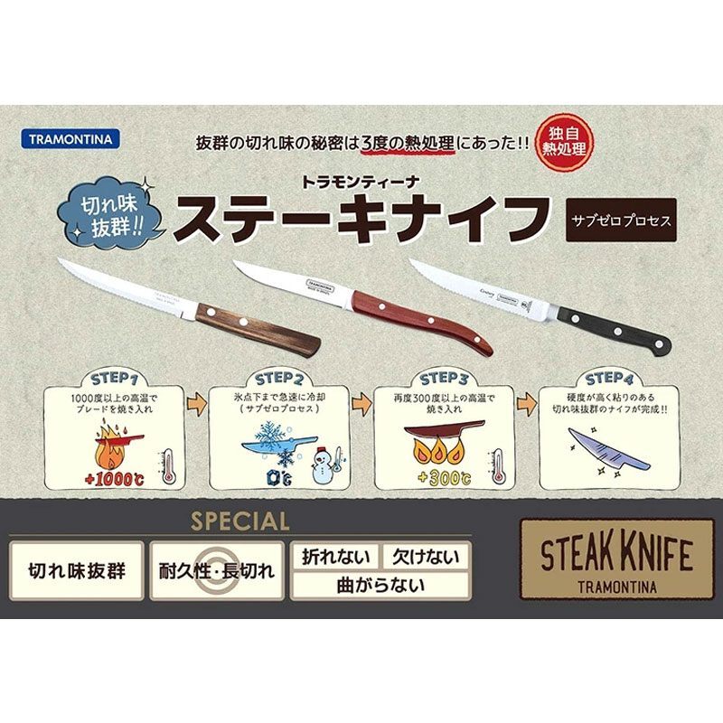 ブラジルのナンバーワンテーブルウェアブランド、トラモンティーナのステーキナイフ6点&フォーク6点の12点セットです。シュラスコの本場ならではの切れ味の良いステーキナイフは、普段使いのお食事はもちろん、シュラスコ・BBQ、パーティーやアウトドアにも大変便利です。切れにくいお肉はもちろん、お野菜なども力を使わずに簡単に切り分けることができます。一度使うと他のテーブルウェアが使えなくなるほど愛用者続出のナイフ&フォークセットです。